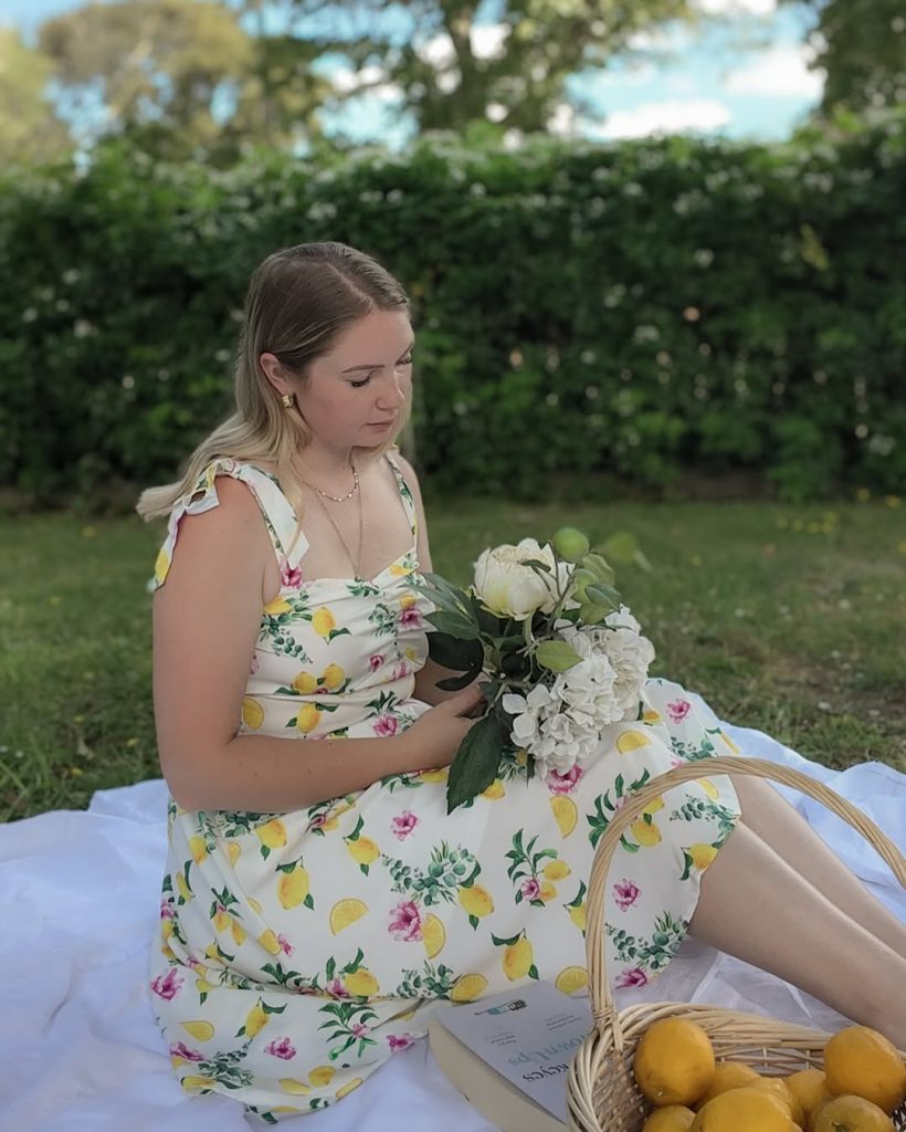 A lemon-and-floral midi dress, gathered at the bodice, turns a simple outdoor lunch into a scene from a storybook summer in southern Europe.