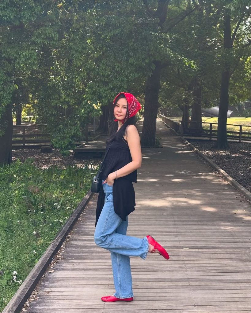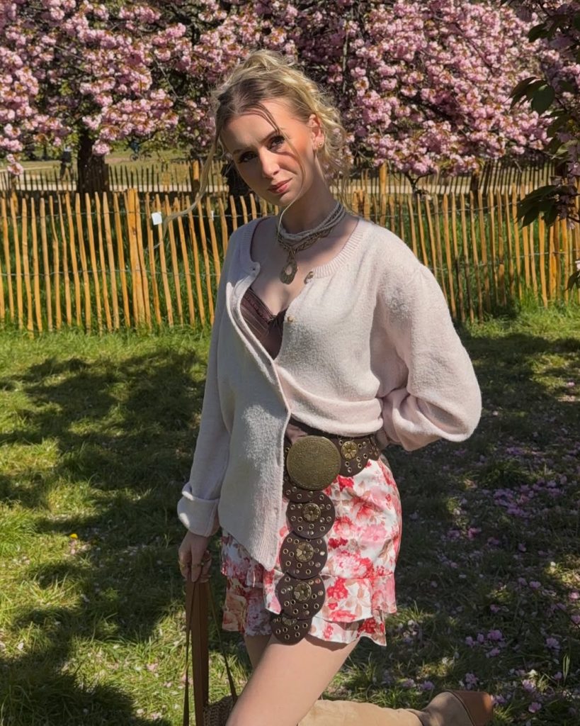 It delivers in the “festival picnic” section of PICNIC OUTFITS 2026 TRENDS “a little bit boho, a little bit editorial” style. It feels modern because of the large statement belt, which skews it from the soft pastels. To ground the outfit, keep your shoes and handbag plain and tan. In fact, I wouldn’t want to accessorize further with anything too bold/heavy, like patterned tights or an outer layer. Just go back to after-school cafe pics in the official park photo-op setting—say, picnicking in an actual park during Cherry Blossoms Fest or art show or market attendance, immediately after.