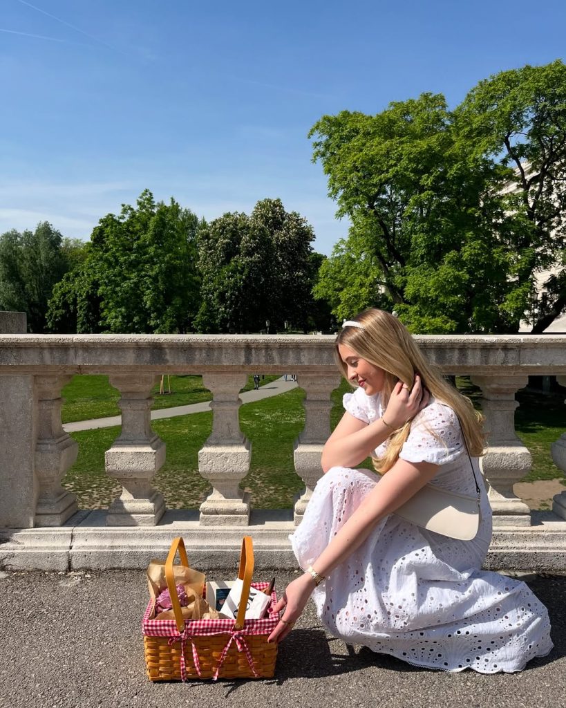“An eyelet maxi dress in white, with a lined basket at the same time as carrying a plain shoulder bag” gives you the forever picnic in the oldest European city park kind of treatment.