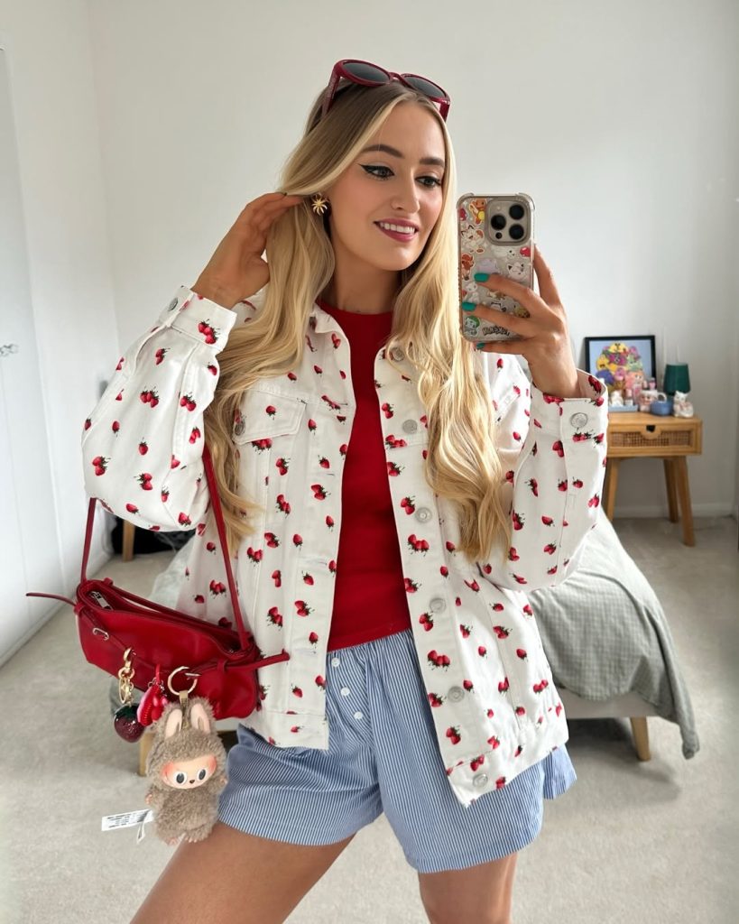 This outfit feels like the blueprint for casual picnic outfits—nothing fussy, just pieces you can mix and match all summer. The gingham top adds a touch of retro charm without veering into costume territory. To make it your own, layer gold necklaces or add a red lip to echo the cheeks. I’d avoid very chunky sneakers; they could overpower the delicate straps of the sandals. Ideal for spontaneous park picnics, farmers’ market runs, or outdoor movie nights where you’re sitting cross-legged on the grass until the credits roll.