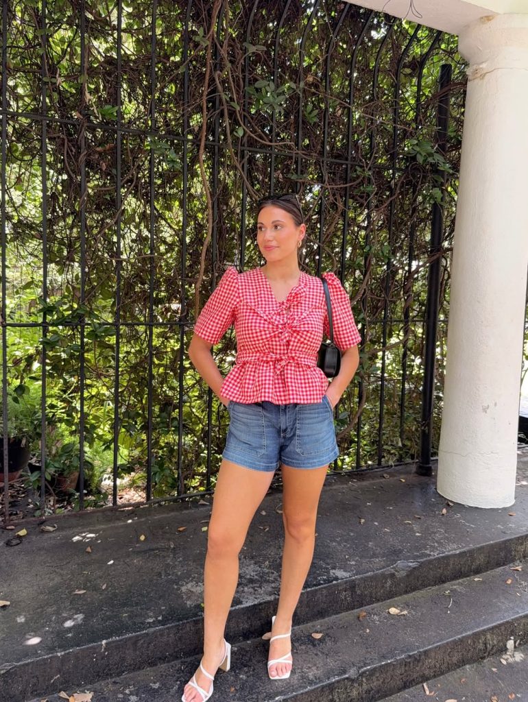A red gingham wrap-style top and denim shorts create that quintessential picnic combination—simple, upbeat, and made for warm sidewalks and shady lawns.