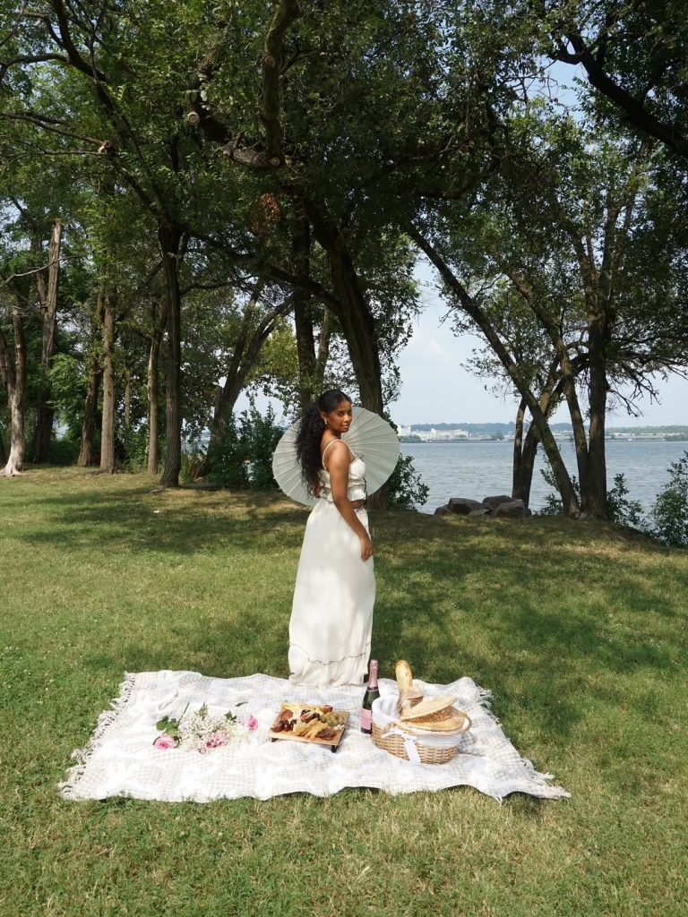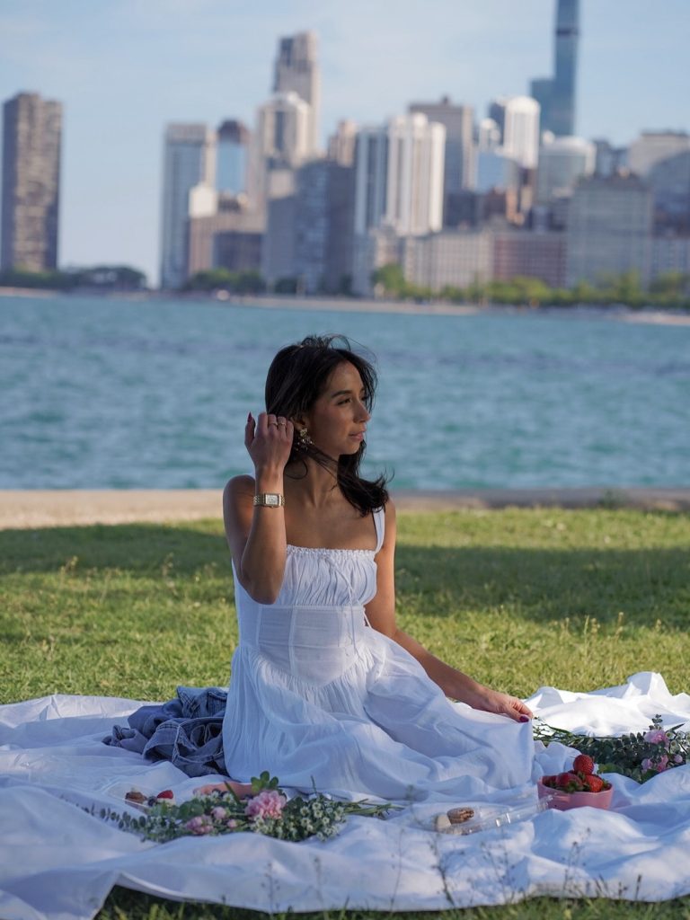 A smocked white sundress, city skyline, and lakeside breeze create a polished yet dreamy urban picnic moment.