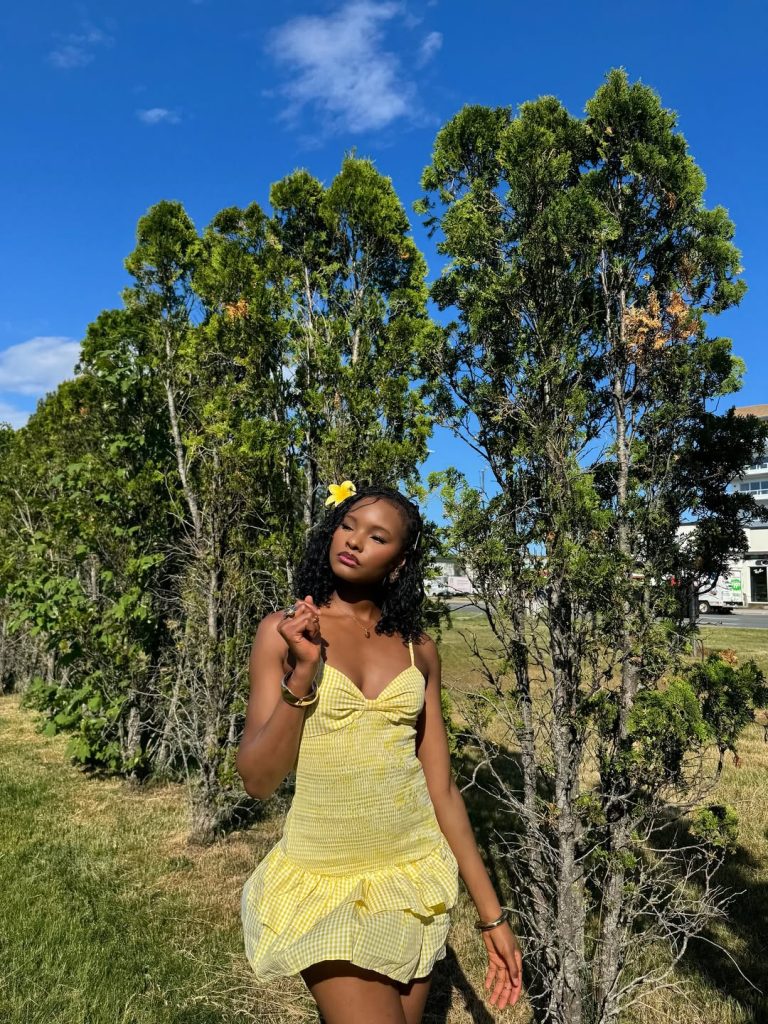 A yellow gingham mini dress and matching flower detail bring pure sunshine energy to a simple stretch of grass.