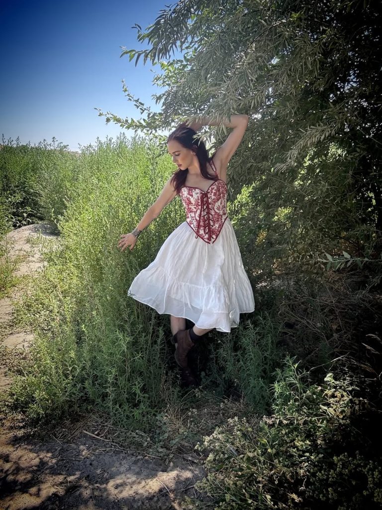 A red embroidered corset and swirling white skirt turn a simple patch of greenery into a stage for fairytale-inspired style.