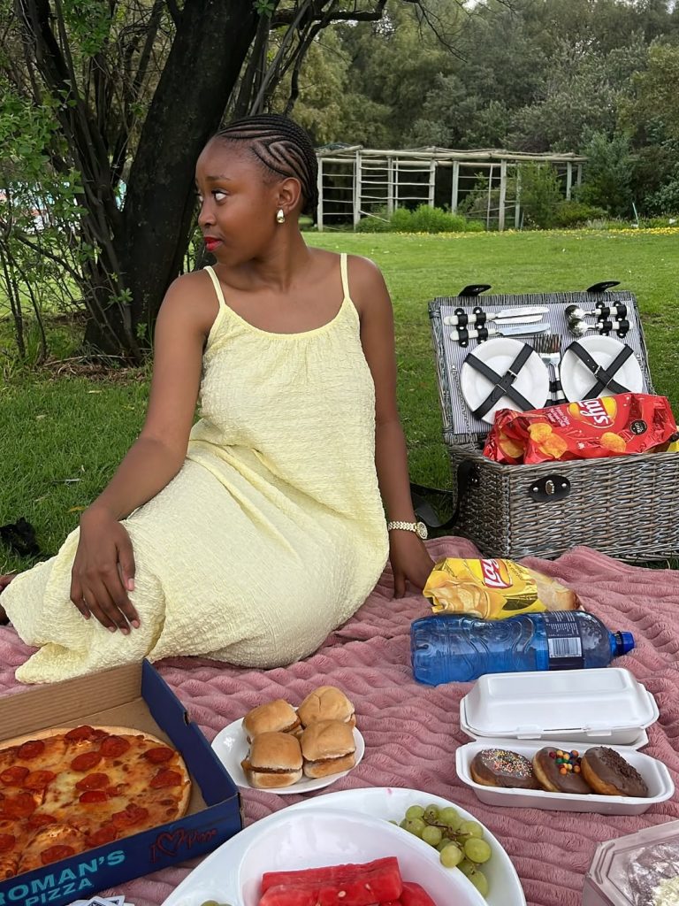 A textured lemon-yellow maxi dress meets a laid-back spread of pizza and sweets, giving this picnic look a joyful, easygoing charm.