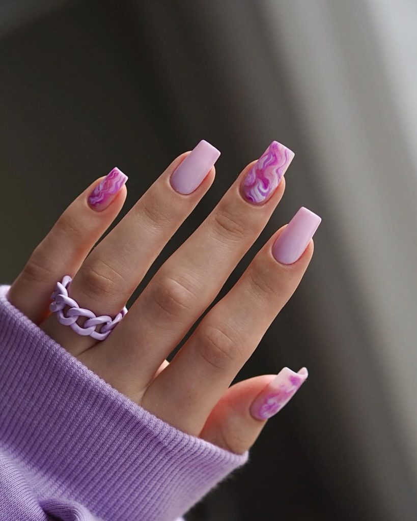 A chic square set in milky lilac gets movement from two marble accents swirling violet and orchid tones. It’s a manicure that feels polished for client meetings but playful enough for weekend plans.