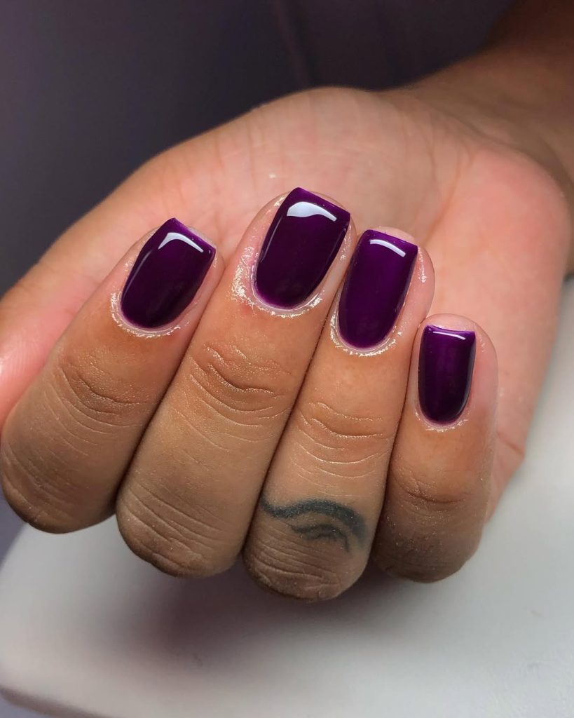 High-pigment Plum—almost cabernet—on a tidy square reads confident and grown-up. The shorter length is practical for typing marathons yet gives “editor at a power lunch.”