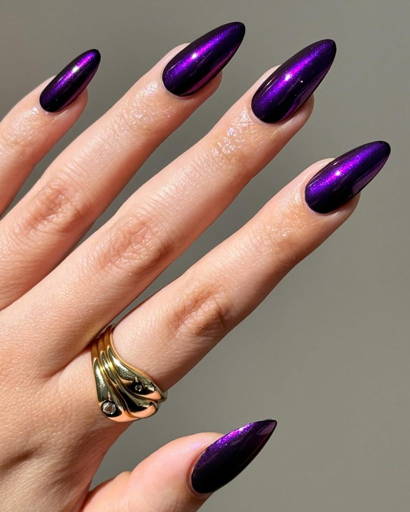 A deep, reflective violet with magnetic shimmer pulls into a diagonal beam—the quintessential cat eye. On elongated almond , it’s nightlife-ready and absolutely Royal .