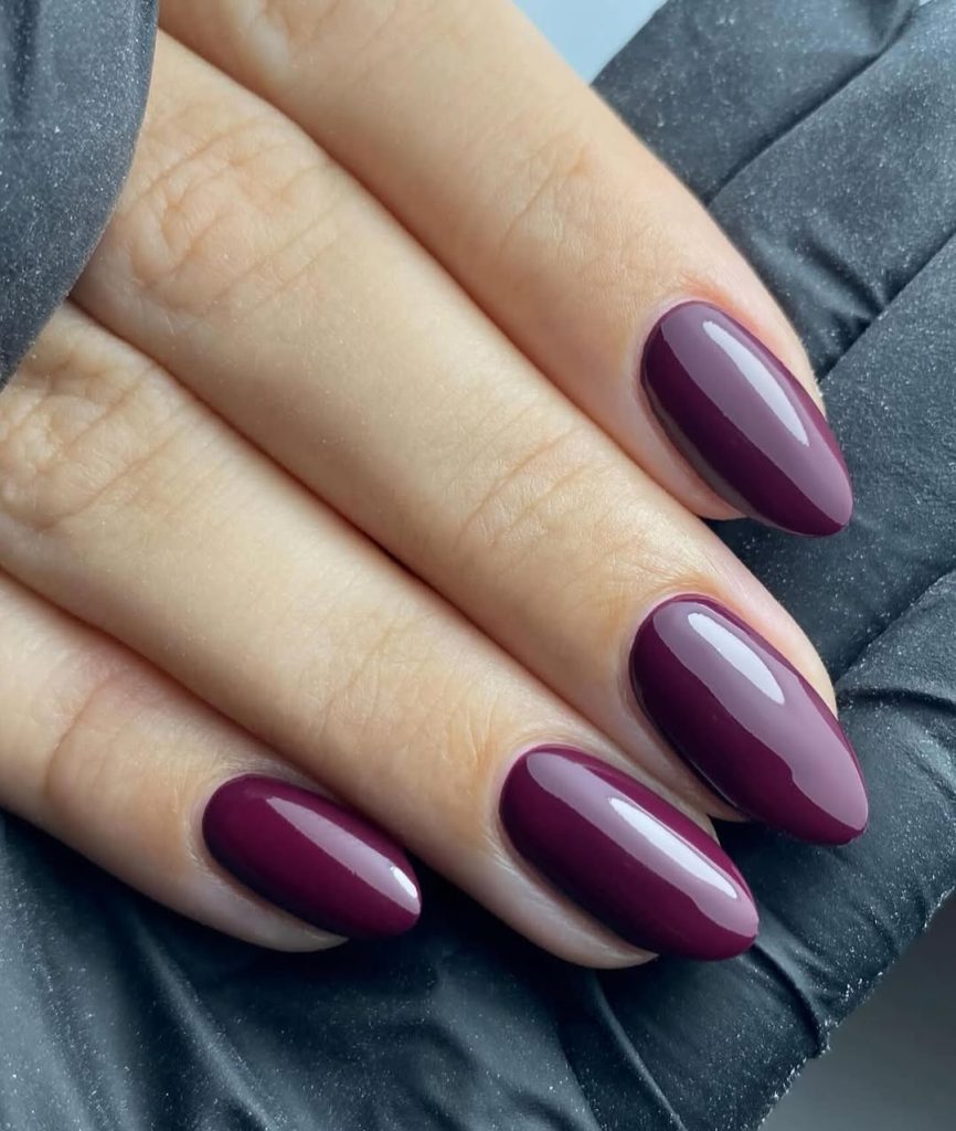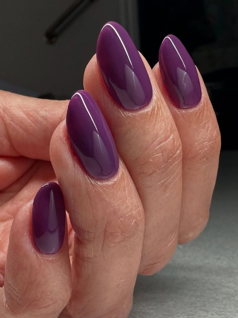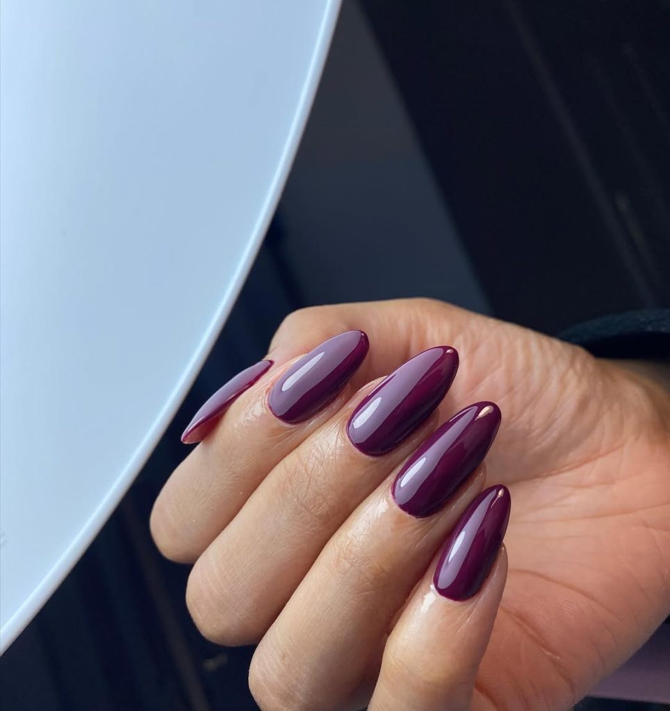 A deep cabernet purple—think evening merlot—poured over sleek almond nails. The shade reads confidently Dark yet refined, almost Royal under warm light. I love this for boardroom-to-cocktail days when your manicure has to carry a whole look.