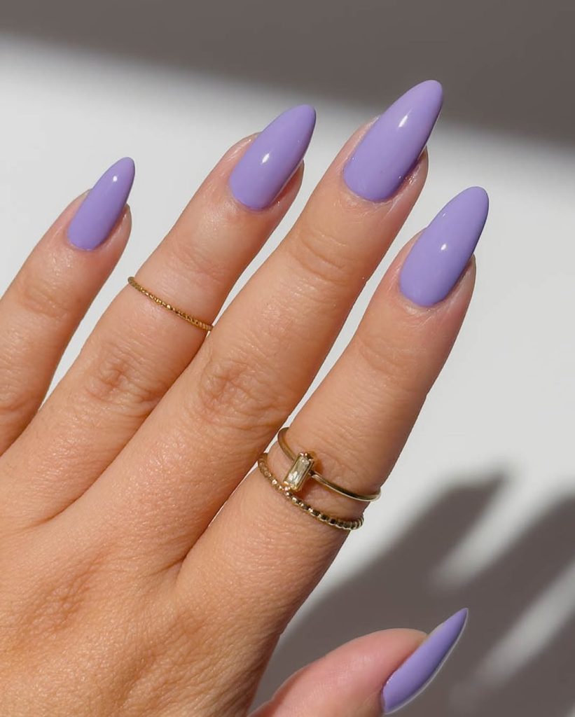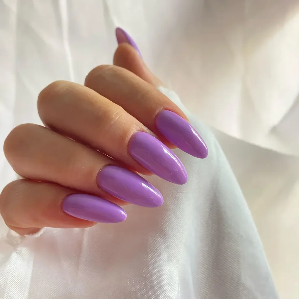 A single-tone lavender on sculpted almond nails—quietly chic and endlessly wearable. It’s the Simple purple that flatters every skin tone and plays nicely with gold or silver.