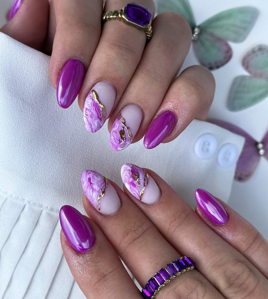 Vivid magenta solids meet lilac marble panels cracked with metallic gold—like jewelry for your nails. The negative space keeps it elegant, not loud.