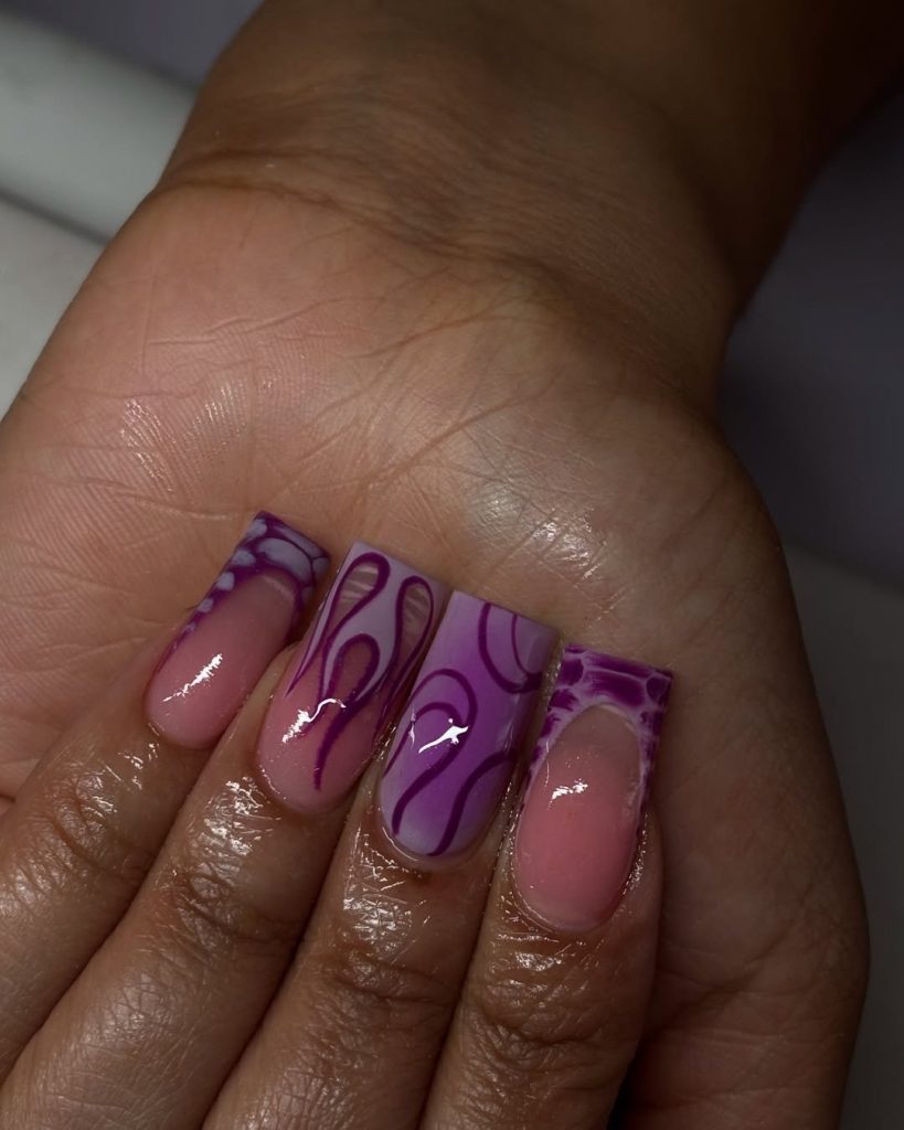 Long square extensions showcase swirled lilac lines, negative space, and glossy top—street-style energy with a precision finish.