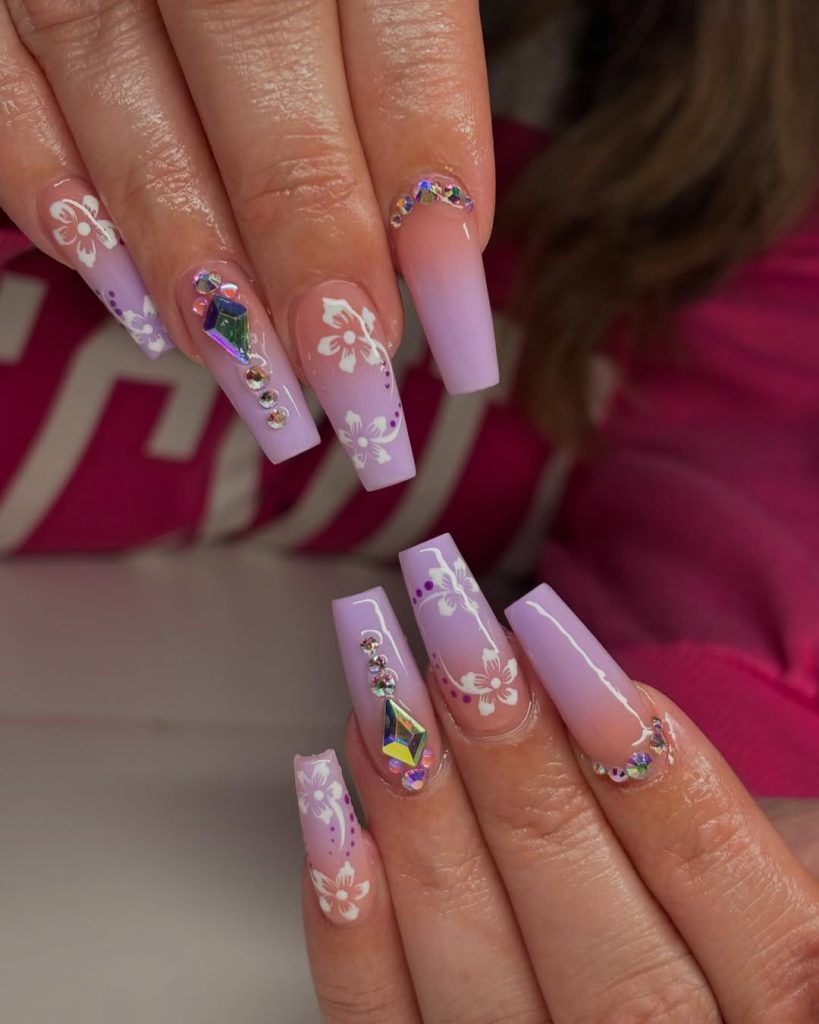 This long coffin set blends Light orchid into soft lilac and dresses the gradient with tiny rhinestone tiaras and hand-painted white blossoms. It’s the kind of Design that turns a casual tee into a “did she plan this?” outfit moment.