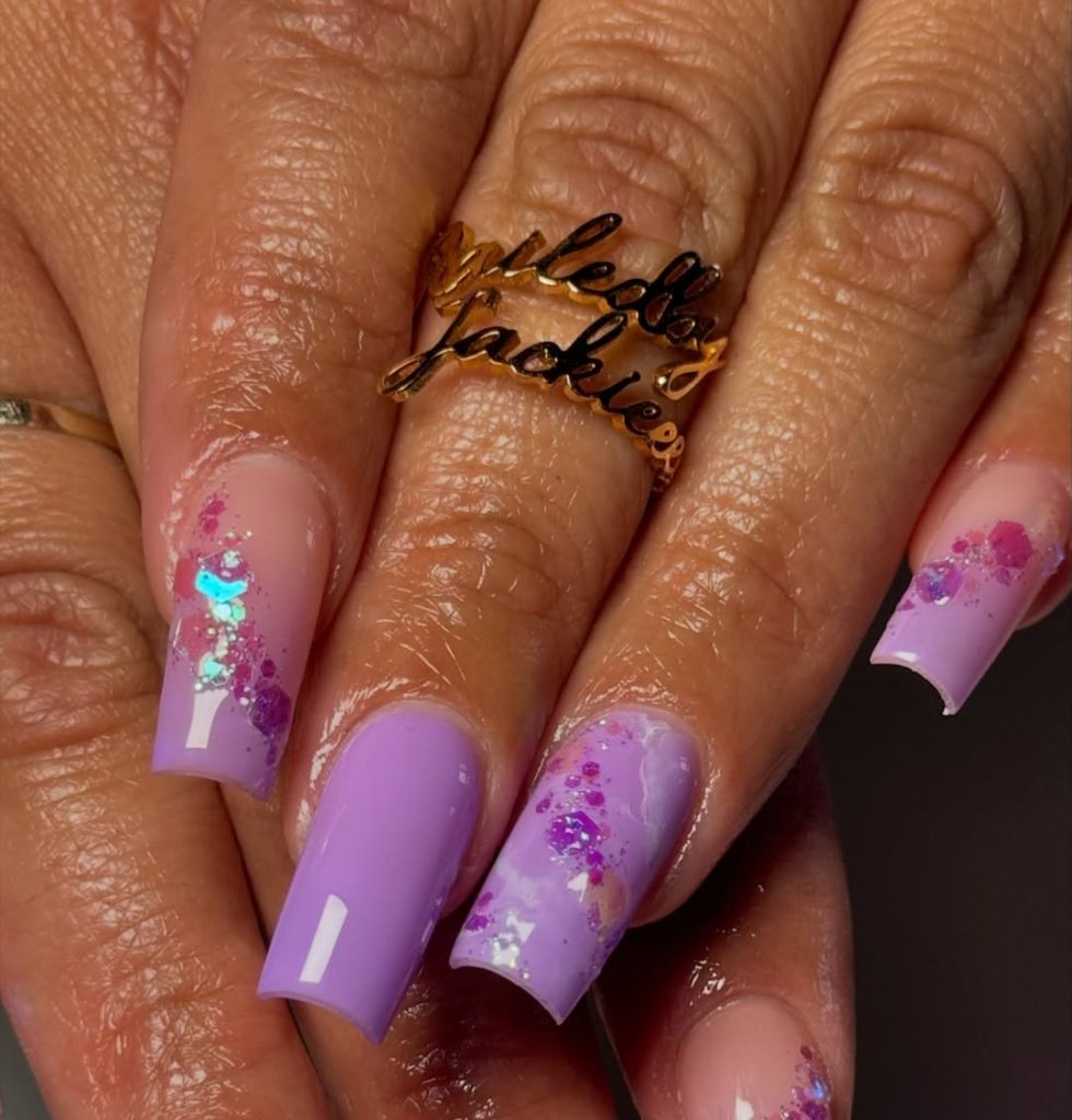 A playful mix: solid lilac paired with glossy confetti fades and a jelly-sheer base. The soft square shape keeps the look polished while the sparkle reads fun.
