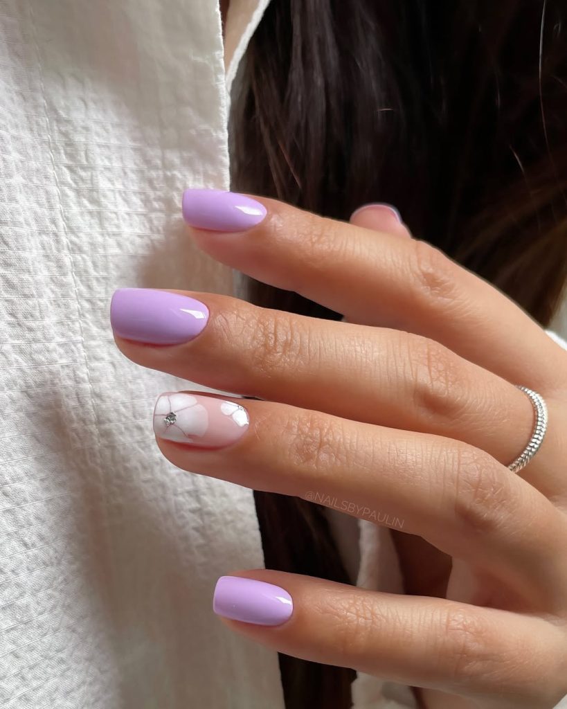 Two solid lilac nails meet three florals dotted with tiny crystals and yellow centers—soft, feminine, and very brunch-with-friends. The square length keeps it practical for day-to-day.