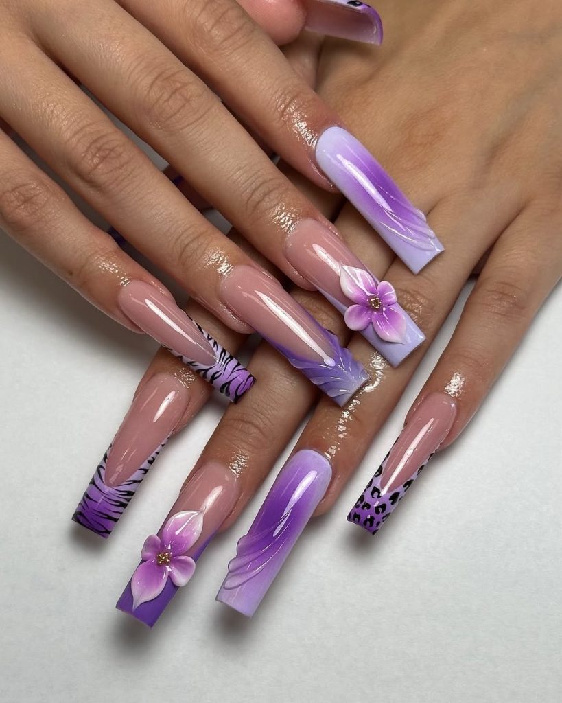 Ultra-long coffin nails mix zebra and leopard details with feathered lilac ombre and delicate 3D petals. It’s fearless Design —equal parts glossy glam and street style.