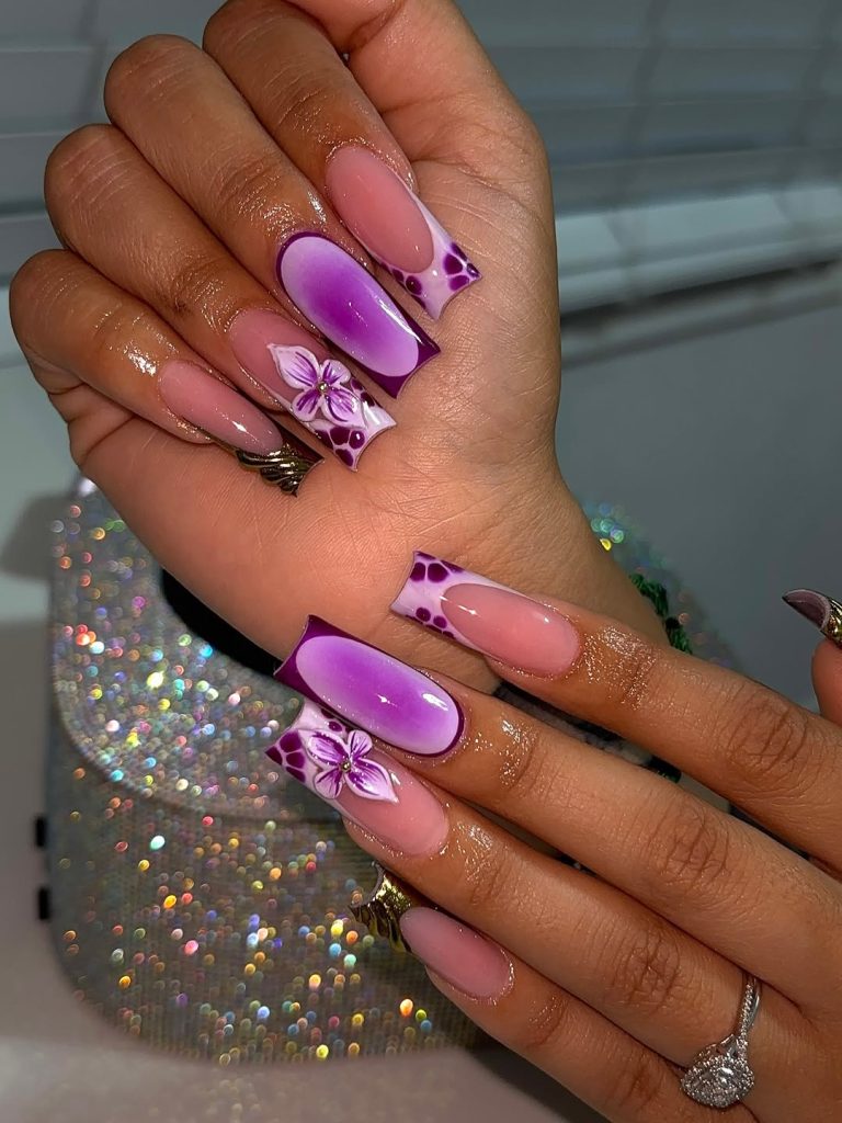 A modern aura french tip in orchid gradients framed by glossy borders, finished with petite sculpted flowers. The elongated coffin shape reads elegant, not extra.