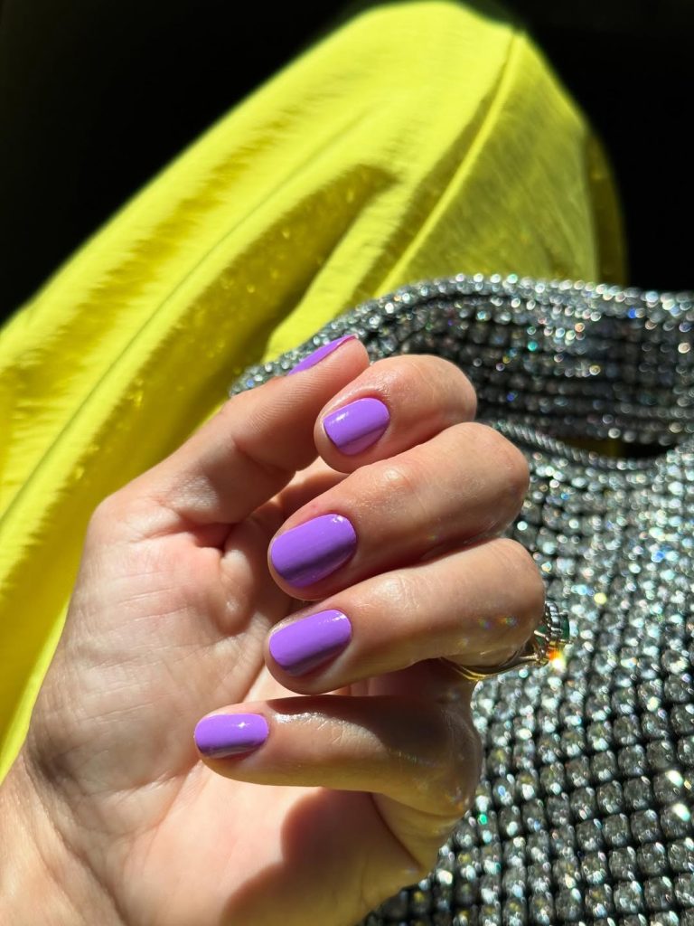 Glossy lavender on neat Short ovals proves that Simple can still feel styled. Against a citrus skirt, the shade reads brighter—those Yellow and purple contrasts are a secret styling hack editors love for summer . Slip on a rhinestone bag and you’ve got desk-to-date polish without redoing your nails.