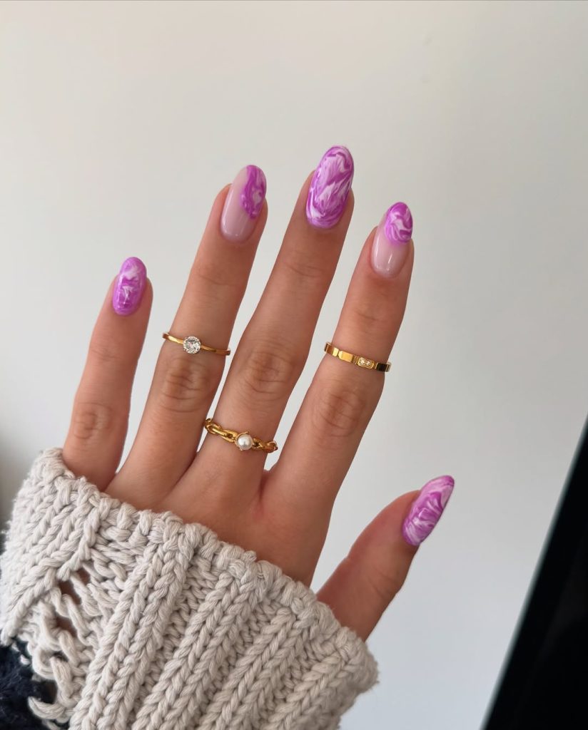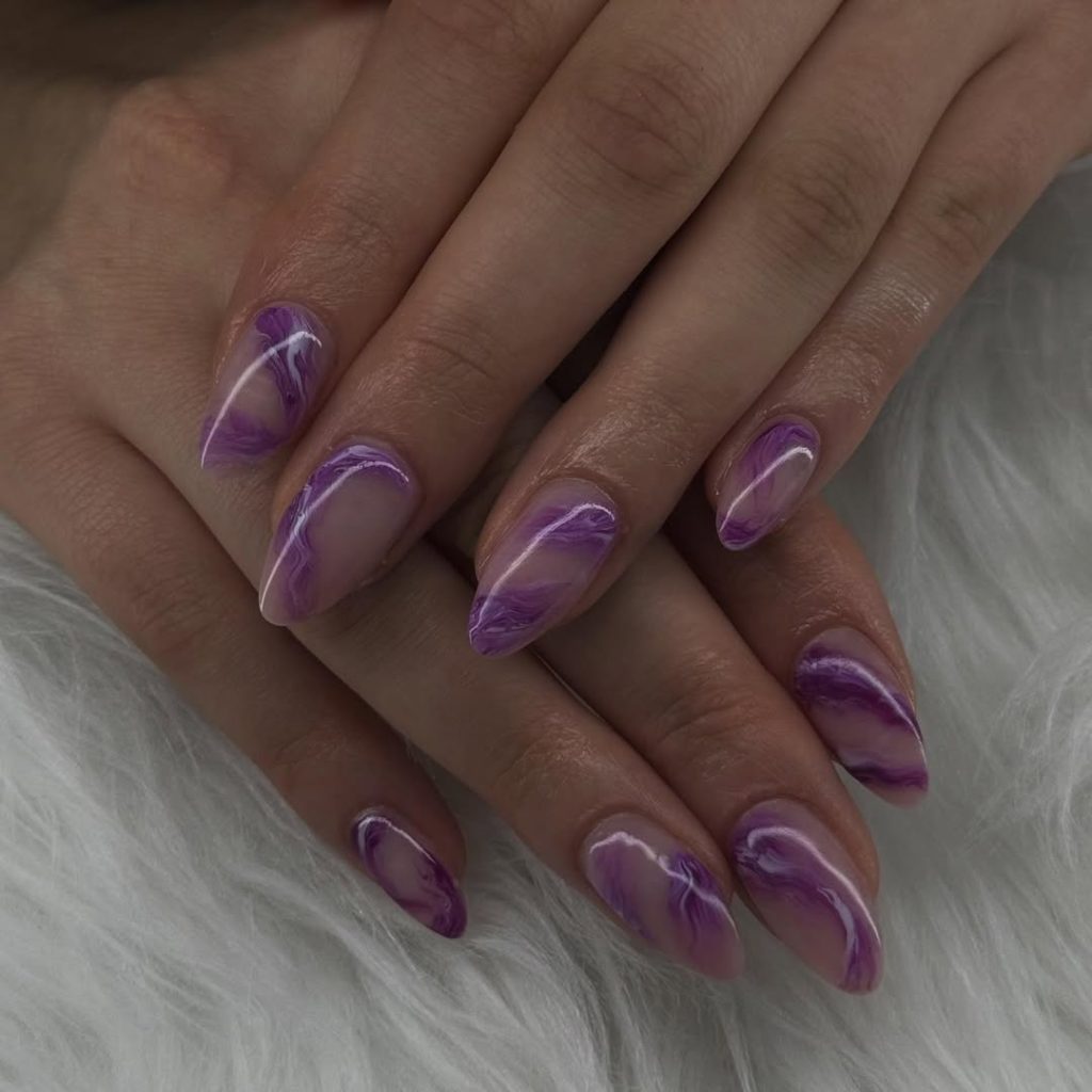 A painterly amethyst marble hugs the edges like a soft french tip , leaving the nail bed sheer. On almond, the effect is delicate but artistic—imagine a silk scarf wrapped at the tips.