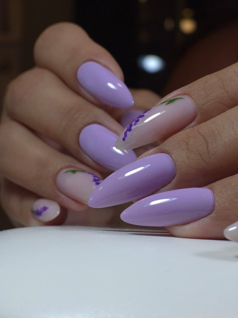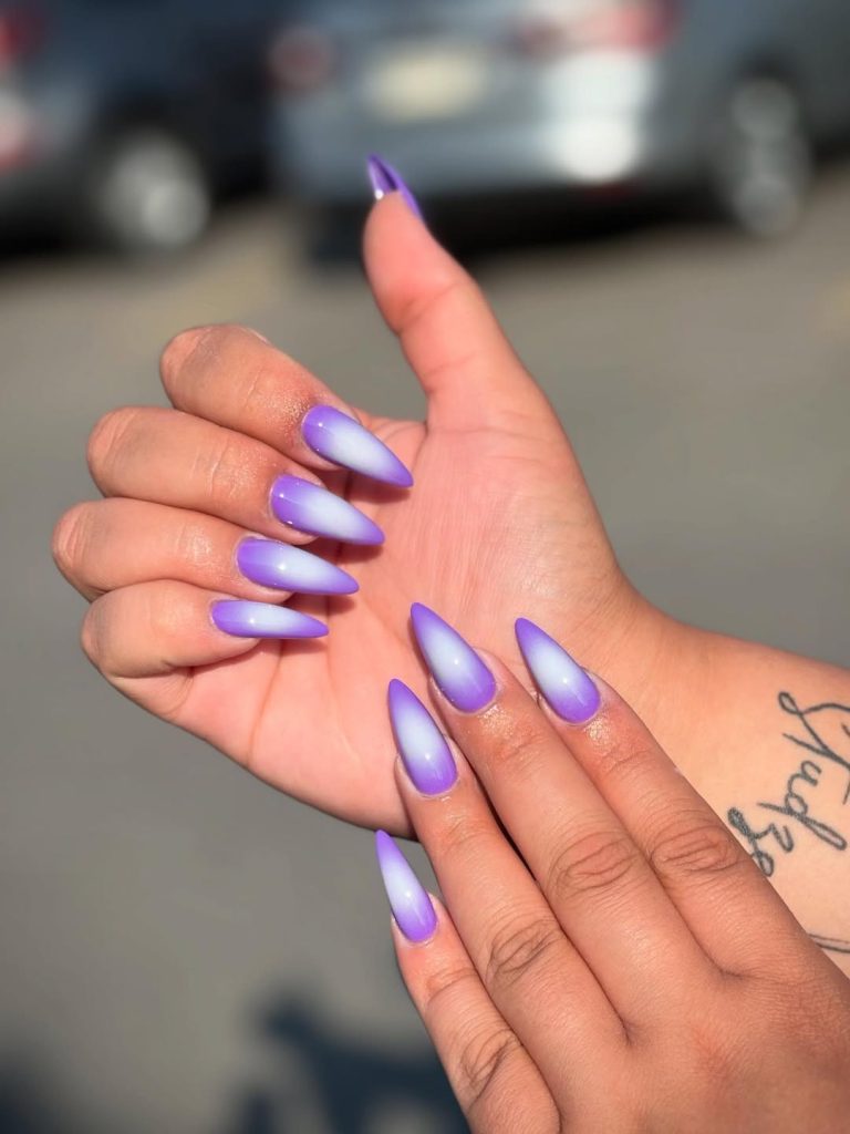 A buttery gradient that feathers from milky lilac to deeper violet at the tips. The elongated almond silhouette lengthens the fingers and photographs beautifully outdoors—prime summer manicure material.