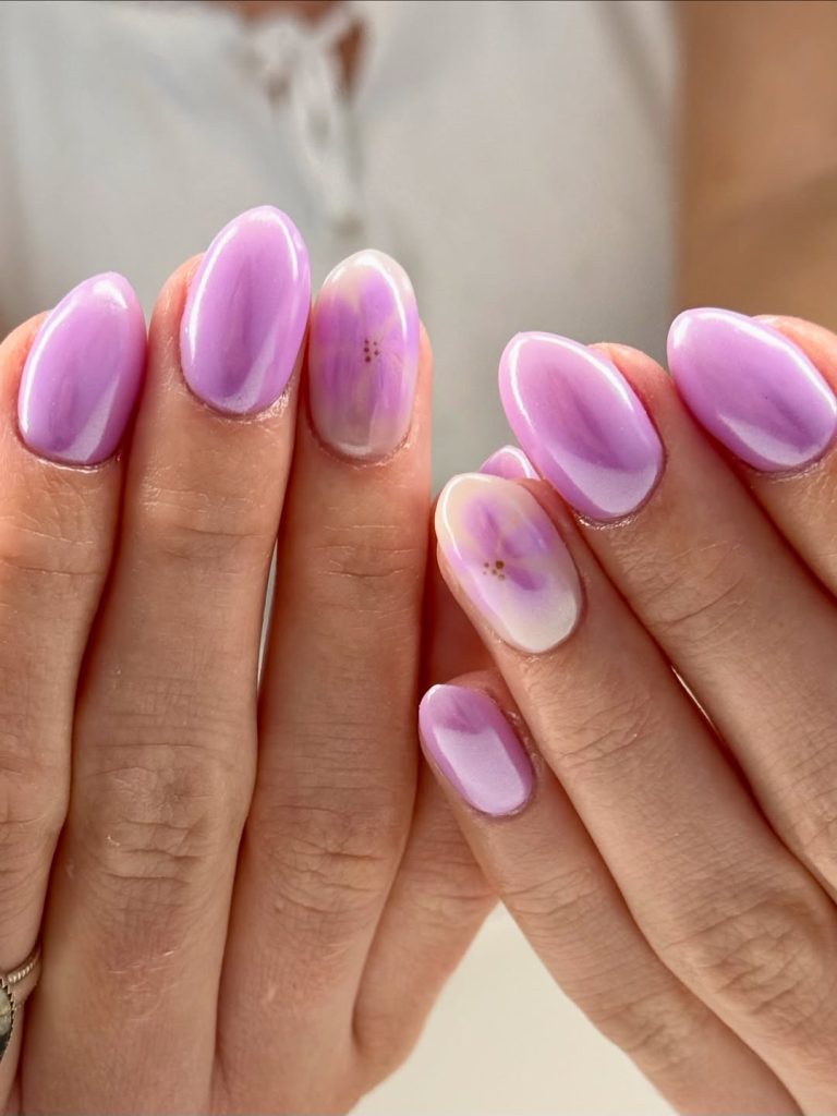A milky-lilac aura kisses the center while one nail carries a watercolor blossom—soft, luminous, and quietly Cute . The pearly sheen brings out the Pink and lavender undertones without skewing sugary.