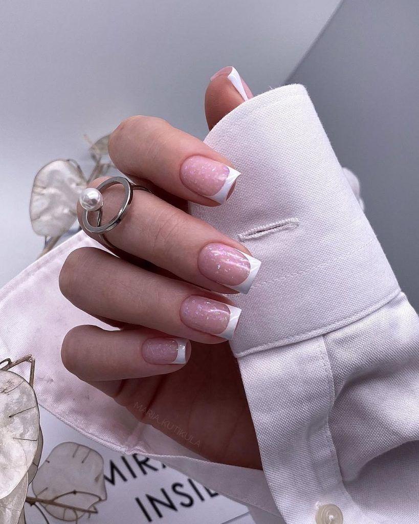 White tips and crystal-clear pink jelly on a clean, bubbly base are adorned with twinkle specks, providing a subtle, office-ready sparkle that is suitable for weddings and date nights, whether worn alone or paired with a classic French look for added polish and a unique flair.