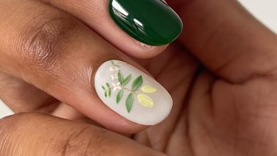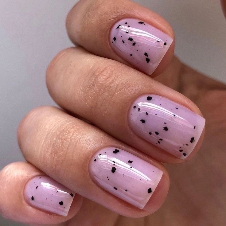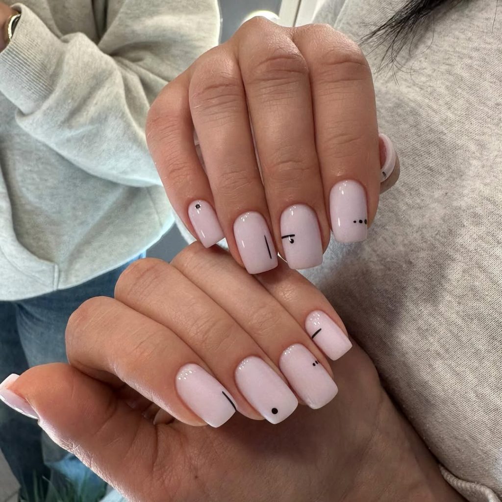 Think modern art: a soft blush gel topped with tiny black dots and micro dashes scattered across different nails. It’s graphic but ultra-simple, the kind of manicure that looks intentional with denim and a heather sweatshirt or a black slip dress. Ask your tech for a glossy finish to keep it defined and clean.