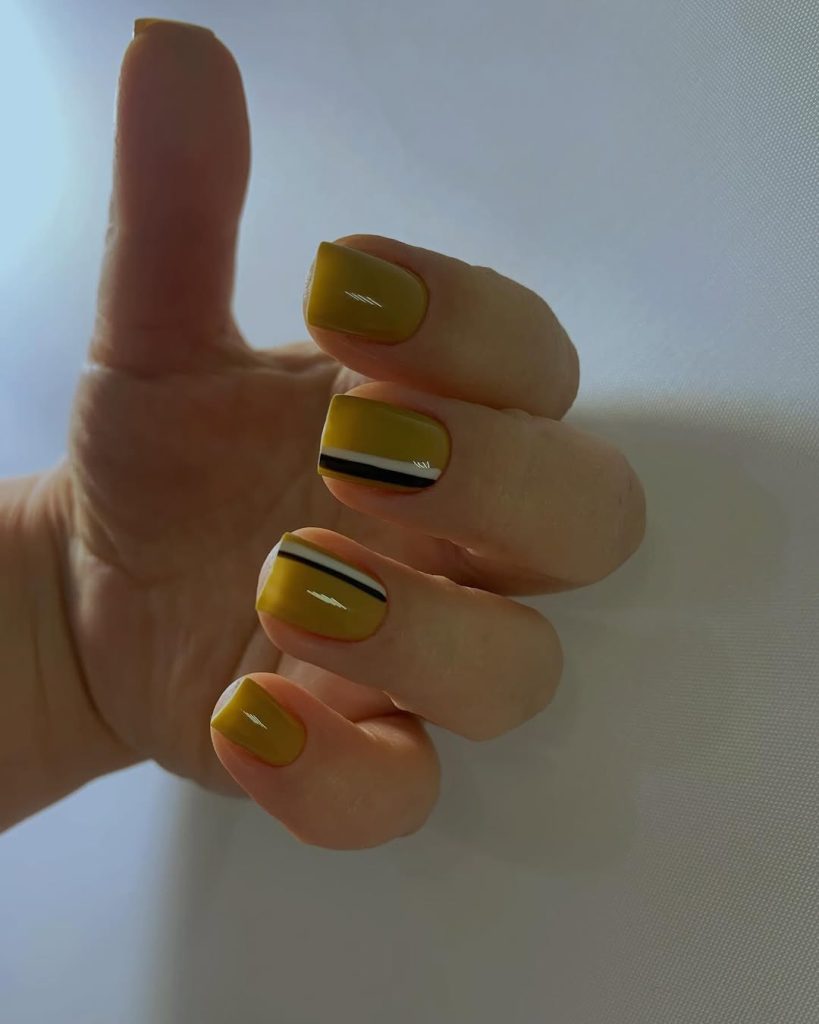 A sophisticated mustard—think gallery-girl neutral—becomes runway-ready with a single accent stripe: black/white/black stacked near the free edge. The short coffin shape makes the graphic moment feel architectural rather than loud.