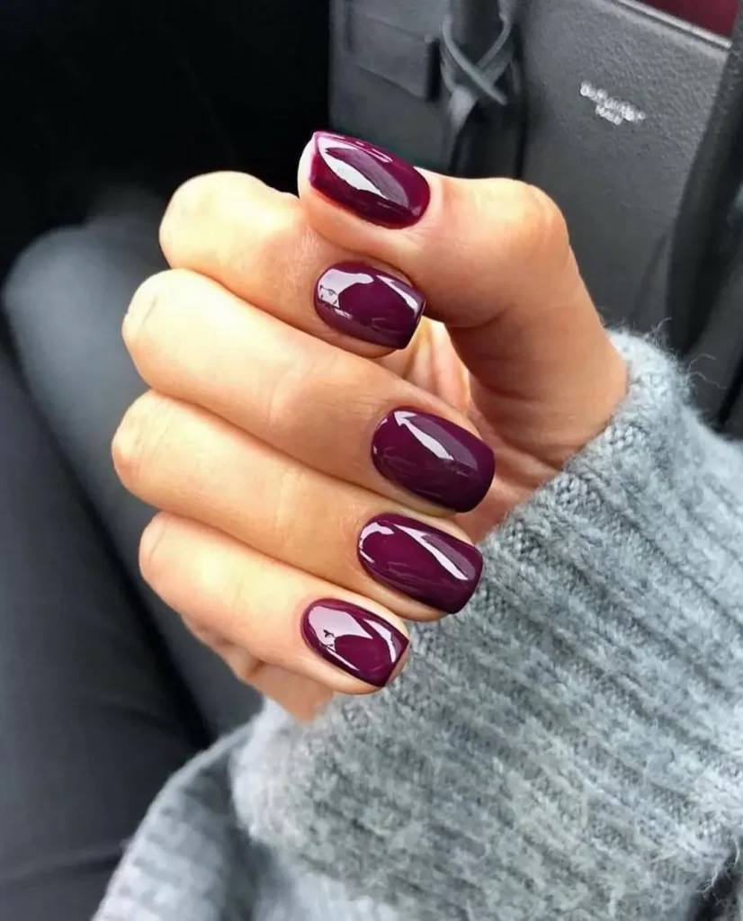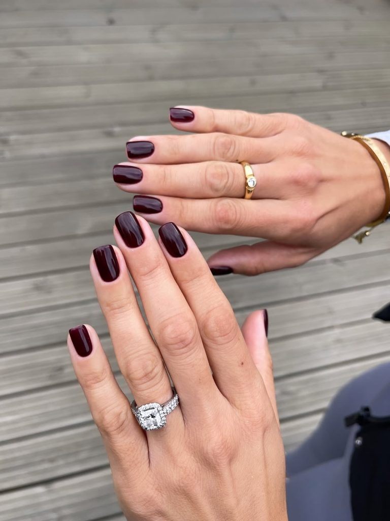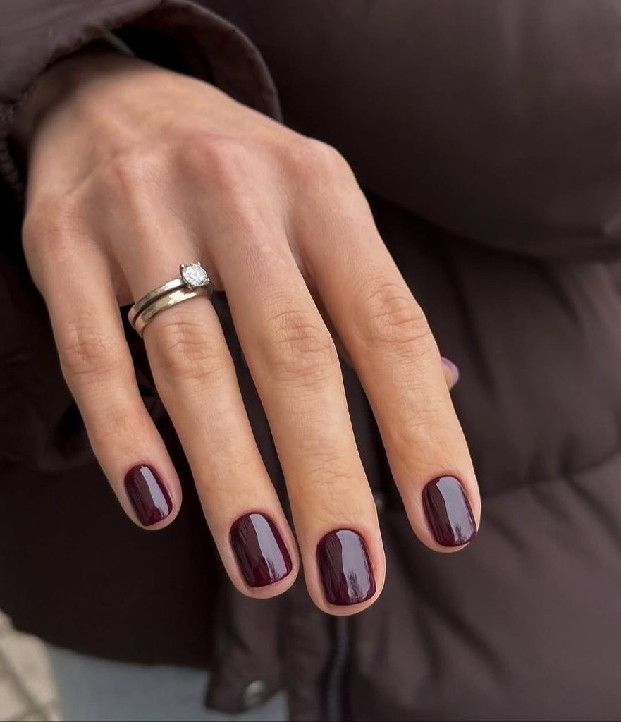 This black-cherry cabernet brings jewelry-box depth to short coffins—sleek, glossy, and undeniably grown-up. The undertone sits between burgundy and oxblood, making it a wardrobe workhorse, with camel coats, cashmere, and leather accessories all fall long. Keep layers thin or add a whisper of acrylic/builder for chip resistance if you travel or type a lot. For styling, mix with gold bands or a signet ring and crisp denim for effortless polish.