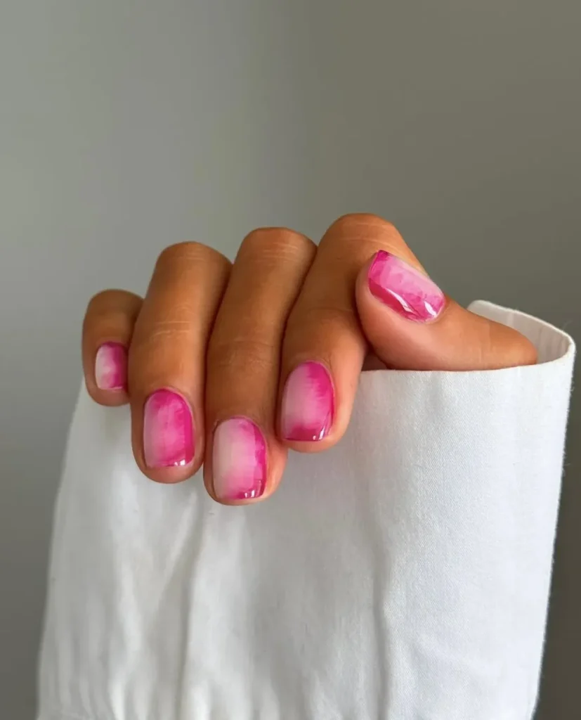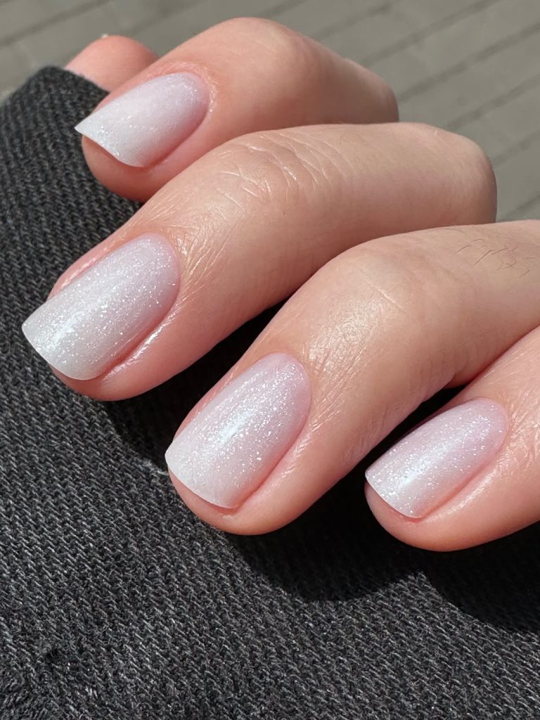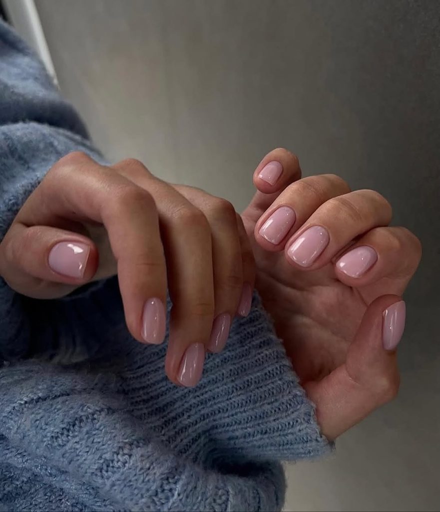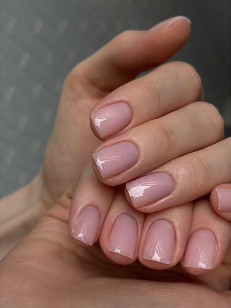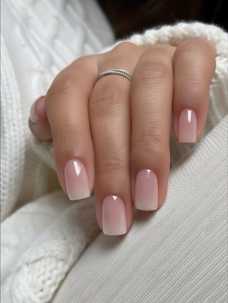 How to request: Sheer milky base, then sponge a cool pink at the perimeter and seal with a gel gloss.