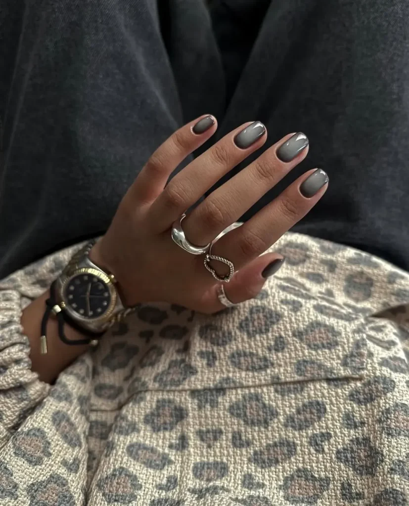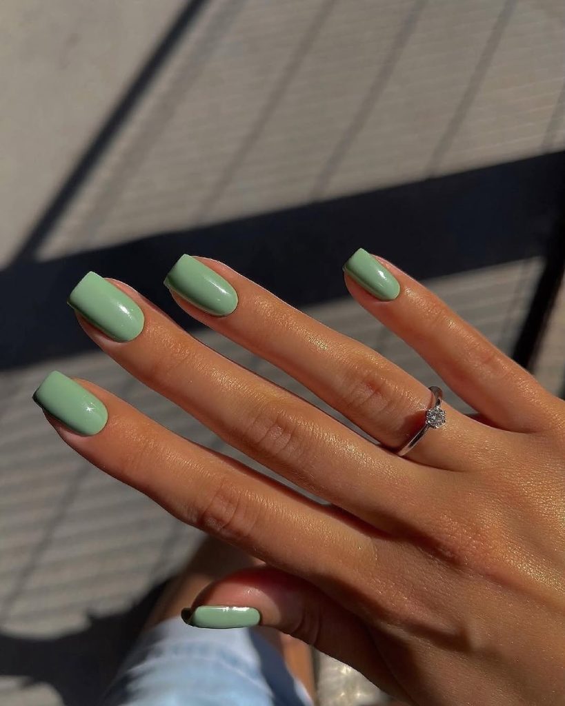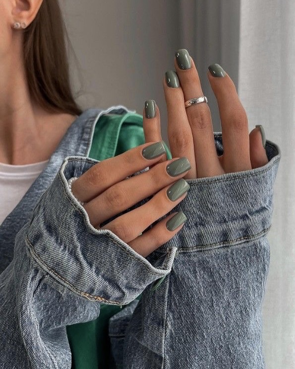 A medium slate green—cool, a touch smoky—turns short coffins into a quiet-luxury statement that works from weekday meetings to drinks. This is your utility color for fall wardrobes full of denim, trench coats, and silver hardware. Ask your tech to cap the free edge so the square tip stays crisp.