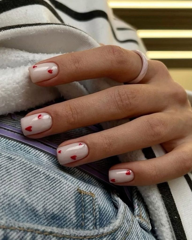 Milky porcelain base + miniature crimson hearts near the cuticle = playful but grown-up. On short coffins, the hearts look curated rather than cutesy, like a fine charm on a delicate chain.