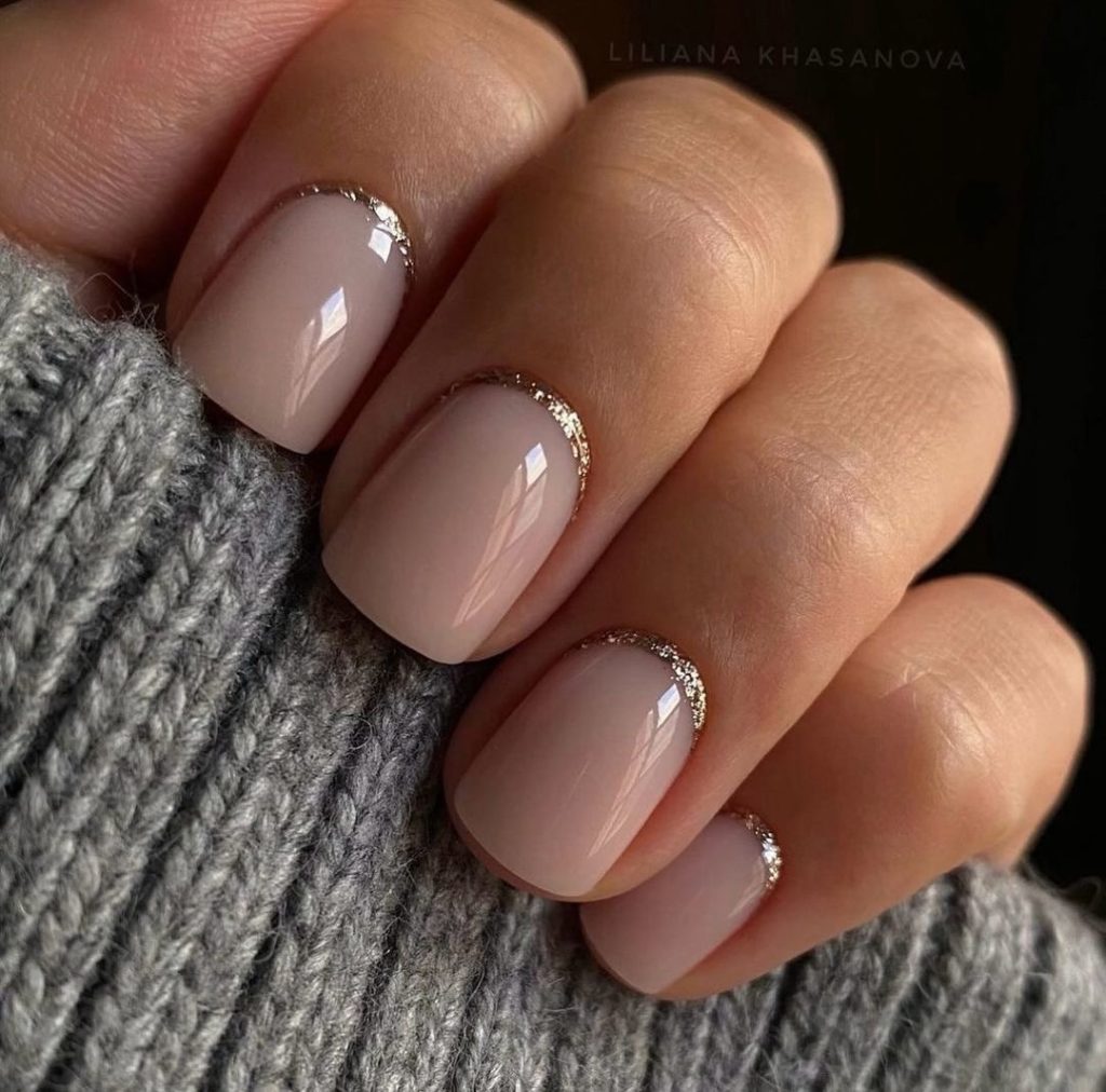 A nude polish is paired with a thin stripe of champagne micro-glitter on the cuticles, a reverse French mani that extends the nail while keeping its tip crisp and office-ready. Think silk camisole underneath a blazer—this is elegance as a secret indulgence.