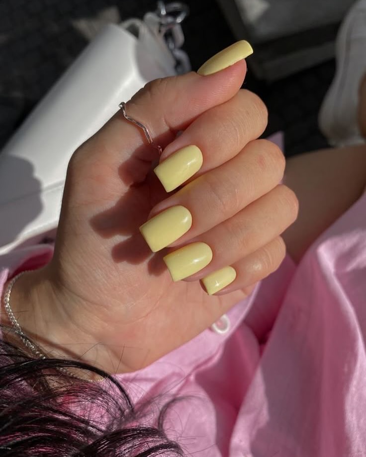 A soft butter-yellow gloss reads cheerful yet polished on short coffin nails—perfect for summer errands or long weekends. The shade sits between pastel and lemon, so it brightens hands without feeling neon. Ask for two thin coats over a sheer builder for a slim silhouette; it’s the definition of simple, classy design with a pop of color. Style it with white denim, tan sandals, and delicate silver jewelry for a breezy, coastal look.