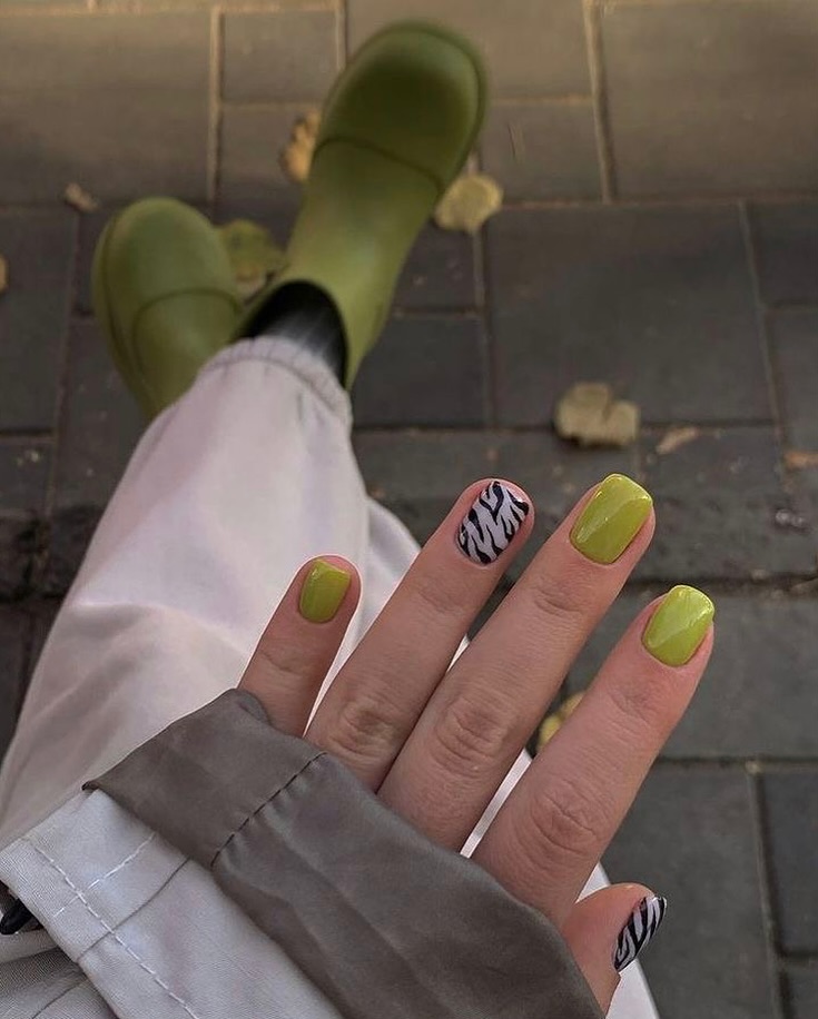 Vibrant lime gloss across most nails meets a single design accent in monochrome zebra—graphic, a little wild, and still neat at a short coffin length. Keep stripes fine and irregular for a fashion-forward finish rather than a costume vibe. Pair with charcoal trousers, a white tank, and chunky sandals for street-style energy all Summer long.