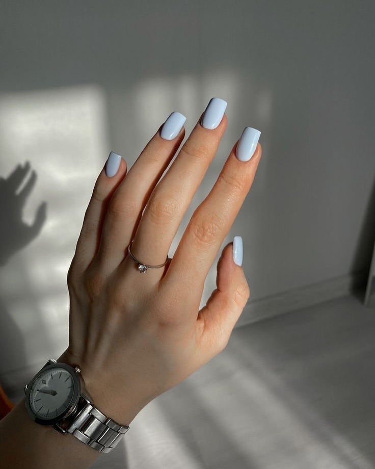 A soft, milky blue reads clean and crisp on short coffins—the manicure equivalent of a perfectly pressed poplin shirt. It’s a flattering choice for tanned skin in summer and a mood-lifter in late spring. Wear with a silver watch and a minimalist ring stack; the icy tone loves cool metals and white linen.