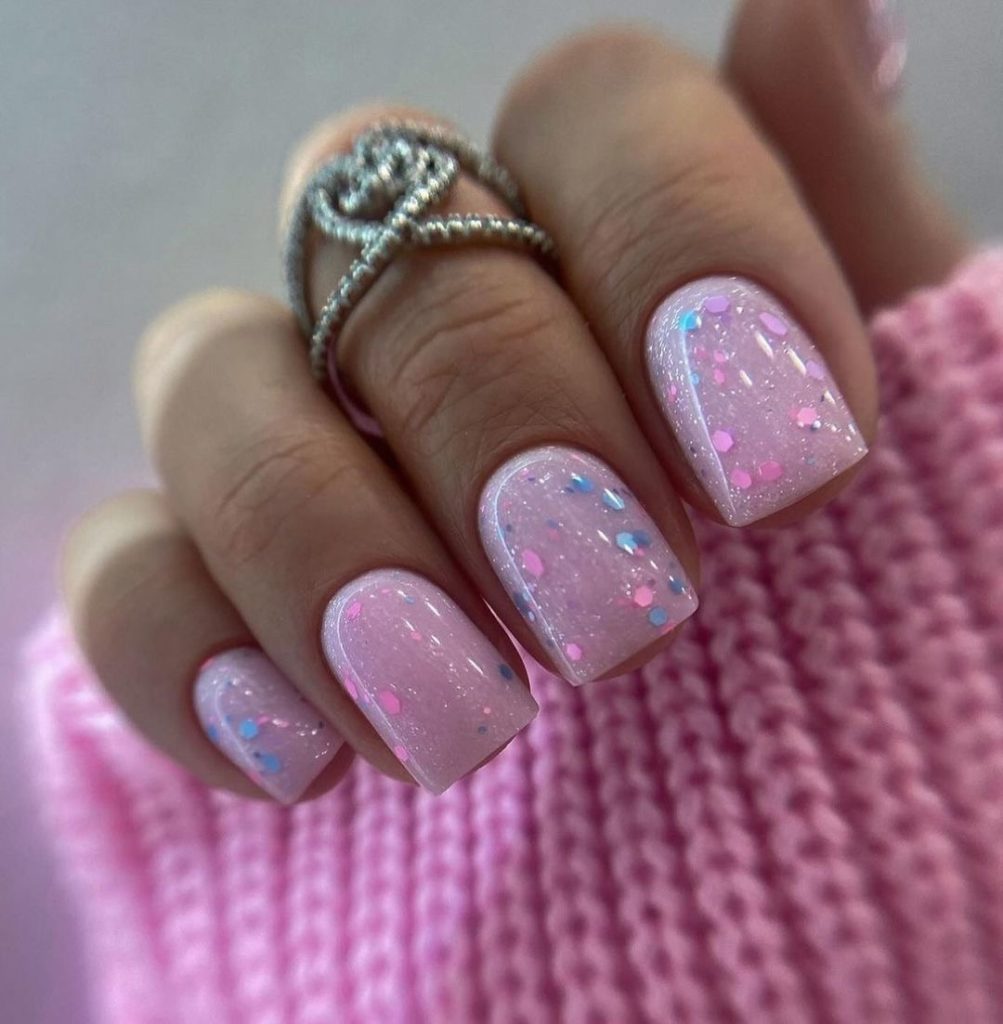 Sparkling milky Pink with scattered pastel confetti—think tiny blue and lilac dots—delivers feel-good color that still reads tidy on short coffins. It’s a sweet choice for birthdays, showers, or weekend getaways. Keep the glitter density light so it stays cute, not chaotic; two thin coats give depth without bulk. Wear with a rosy knit and glossy lips for maximal charm.
