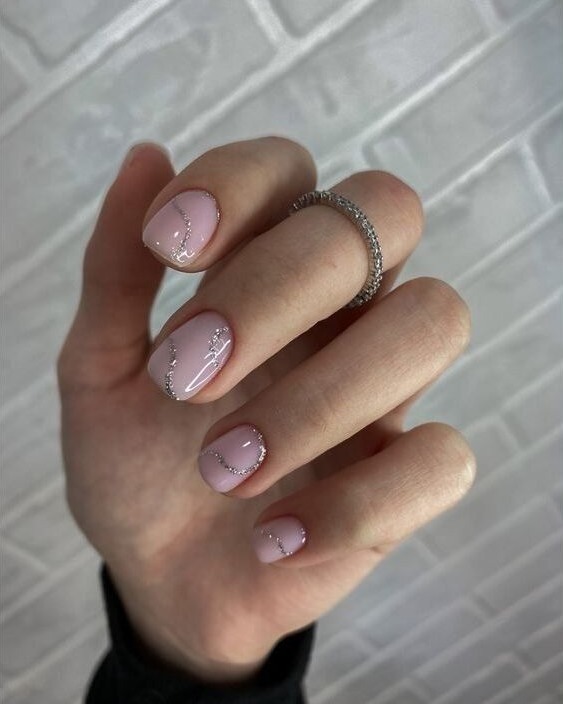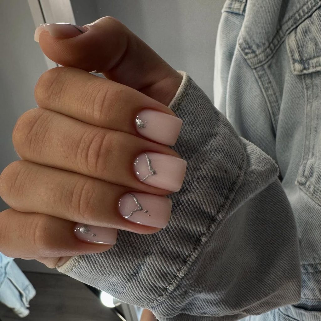 A translucent blush base is dotted with “melted” silver foil and tiny chrome slivers, placed asymmetrically across the nails. The effect is jewelry-like and still restrained on a short length—great for parties when you want something a touch extra without bulk. Pair this manicure with a denim jacket and a satin cami.
