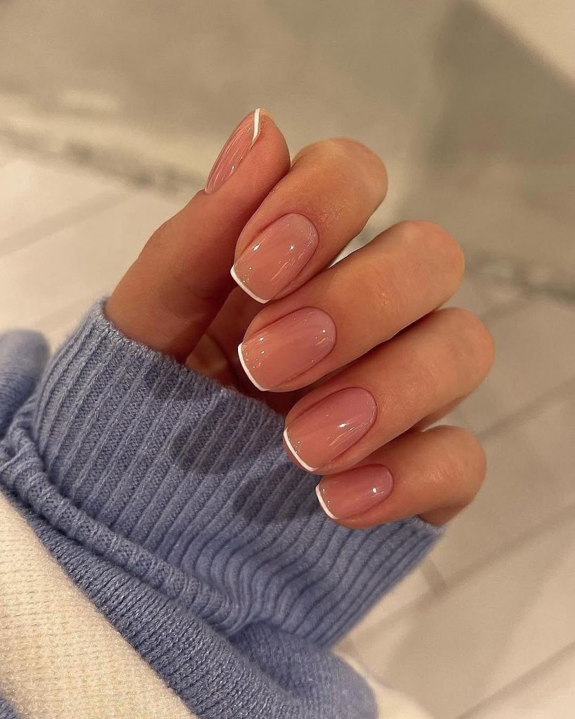 A sheer, cool-pink base scattered with delicate sparkles meets a razor-clean white French tip—scaled down to a slim smile line that suits short coffins perfectly. This is the manicure version of a crisp Oxford shirt: timeless, polished, and incredibly cute. Ask your tech for a neutral jelly base and skinny, sculpted tips that echo the coffin’s flat edge.