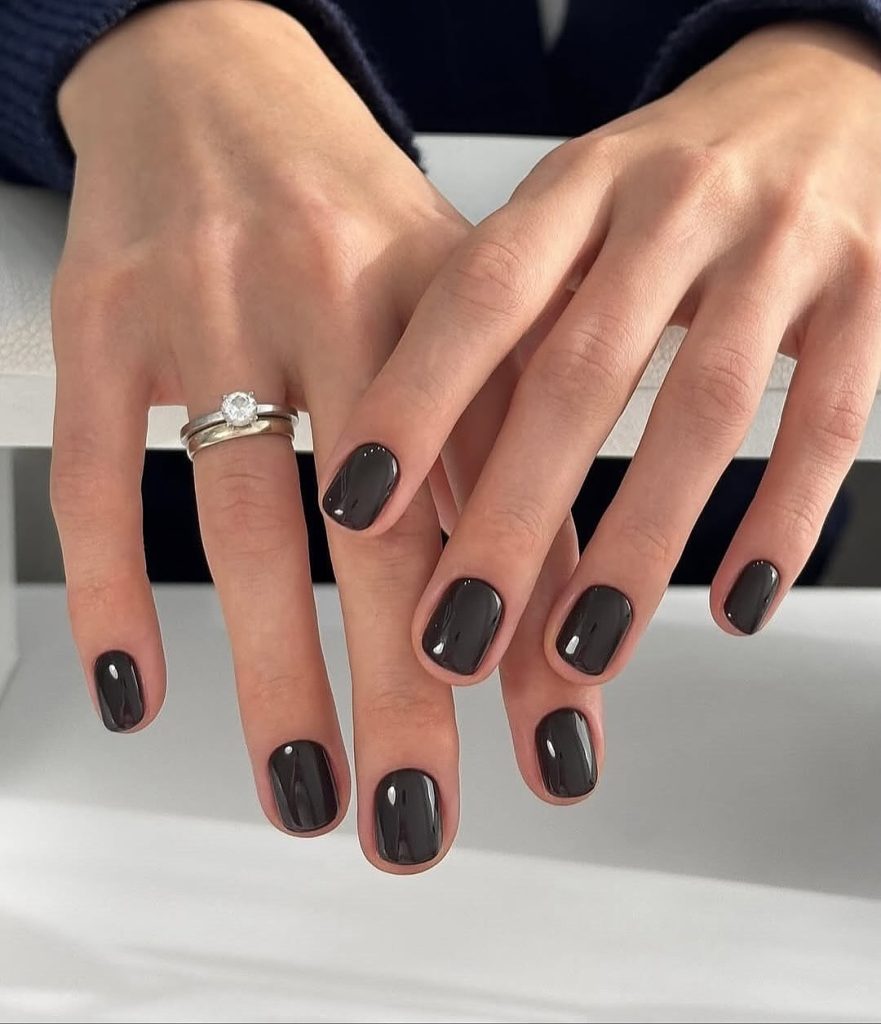Nearly black espresso with a high-shine topcoat turns short coffins sleek and architectural. This hue is fashion-week practical: it matches everything, from navy knits to leather jackets. Keep coats thin so the coffin edge stays crisp.