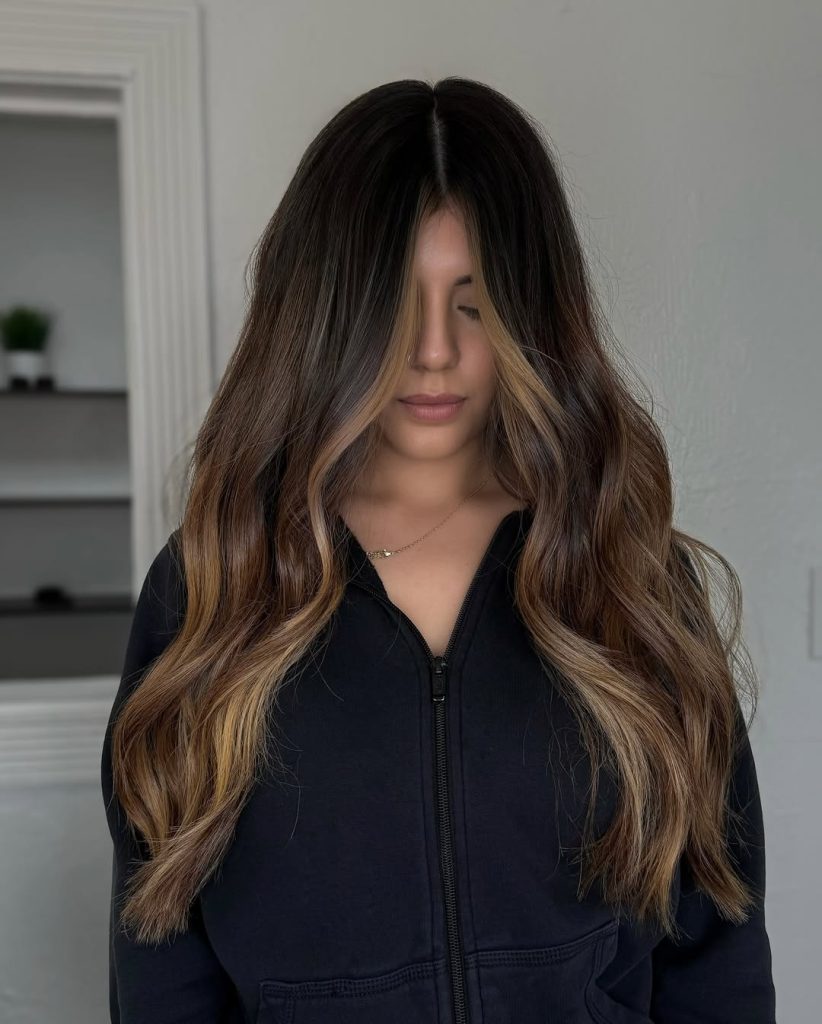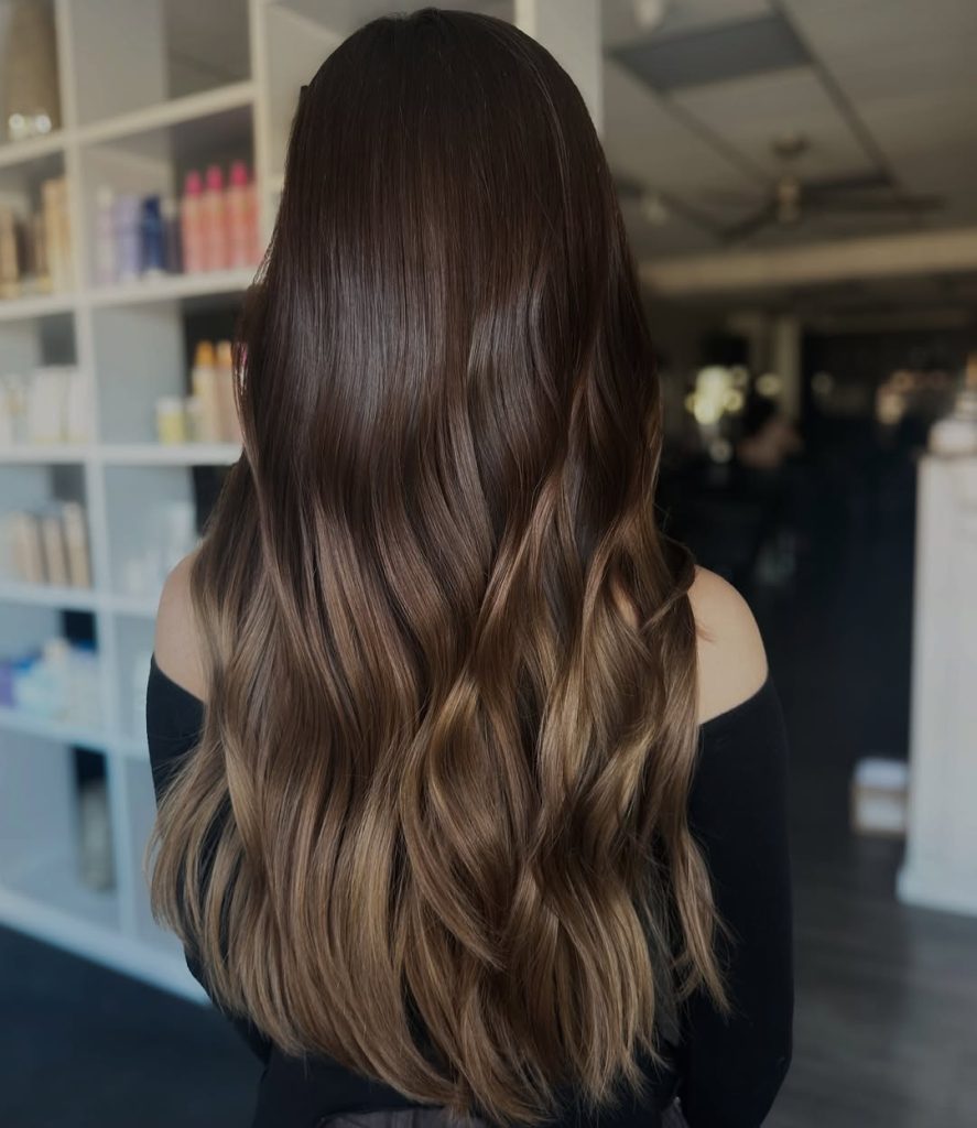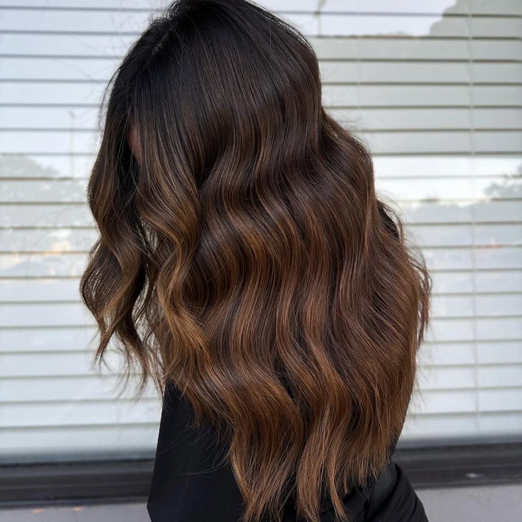 Here we see a textbook example of brunette brown balayage highlights for brunettes done with restraint. The darker root melts gradually into light golden tones, giving the hair a sun-warmed finish that feels effortless rather than styled.