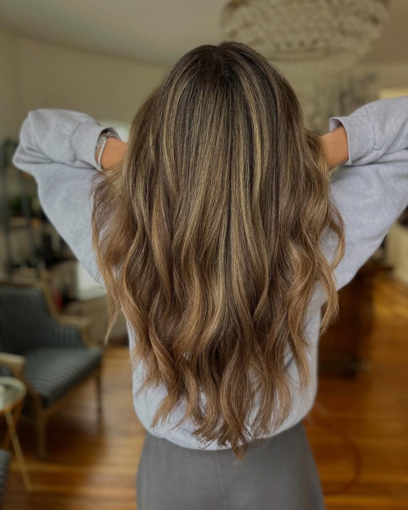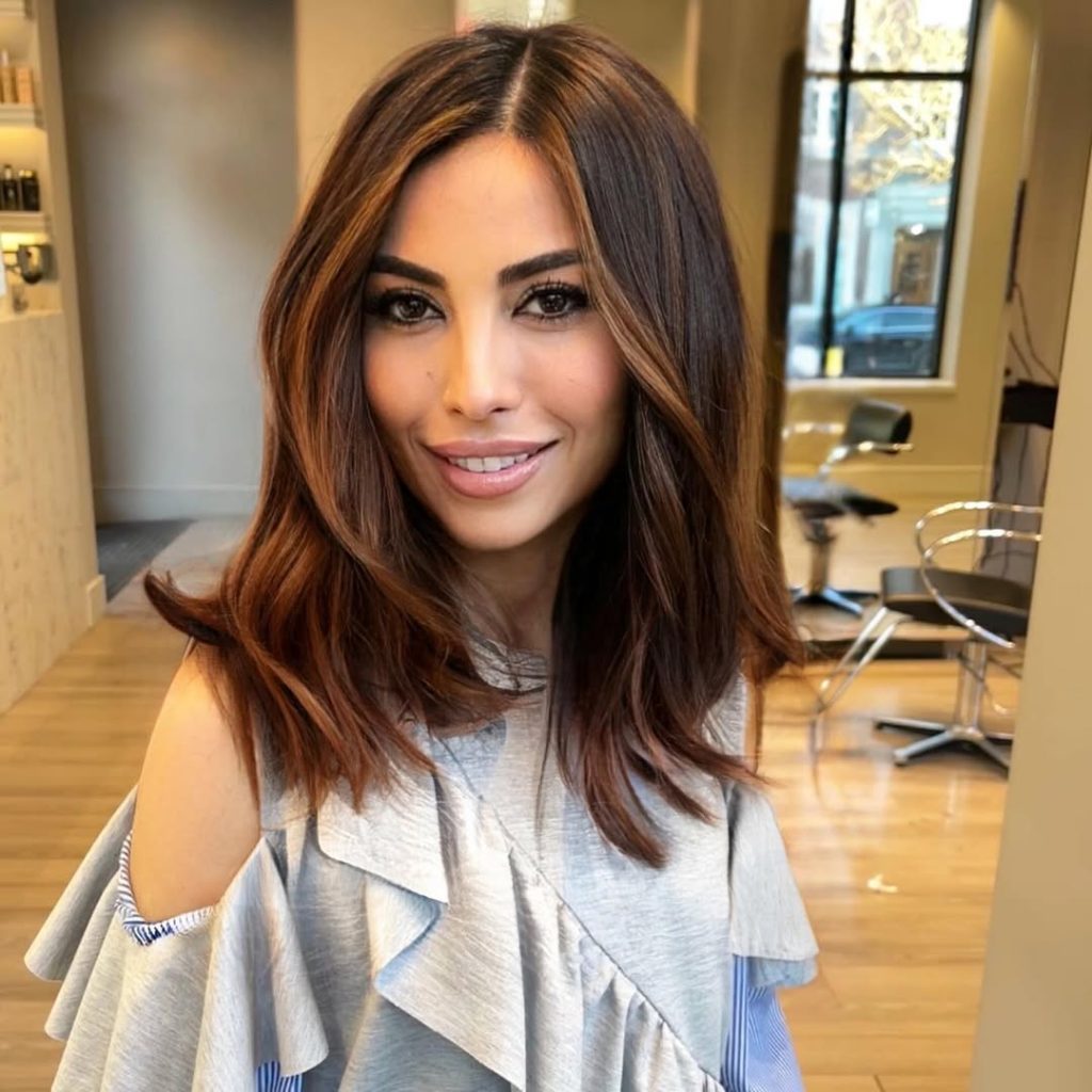 This shade is ideal for women who appreciate spring hair colors for brunettes but do not want to see any actual lightening. Celebrity colorists have been known to call this finish “quiet luxury”—its sexy, easygoing shade looks perfect with a minimalist wardrobe and grows out in stride.