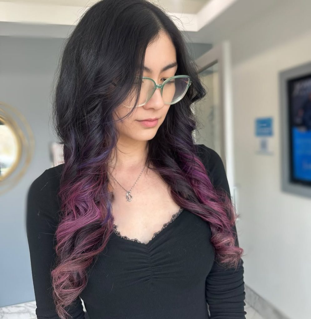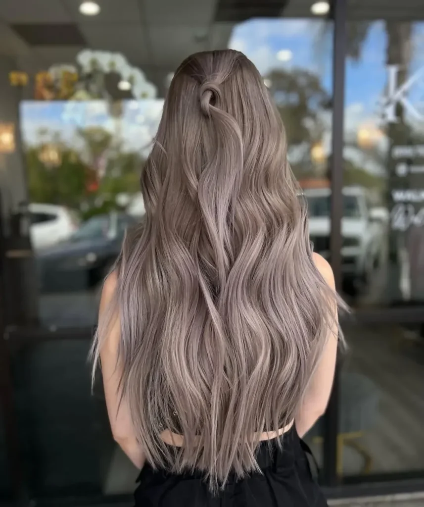 It brings out the more romantic side of spring hair color 2026. Dusty lilac lengths over a dark natural base result in a sultry ombré that feels light instead of heavy. The color is intentional—a muted, cool elegance.