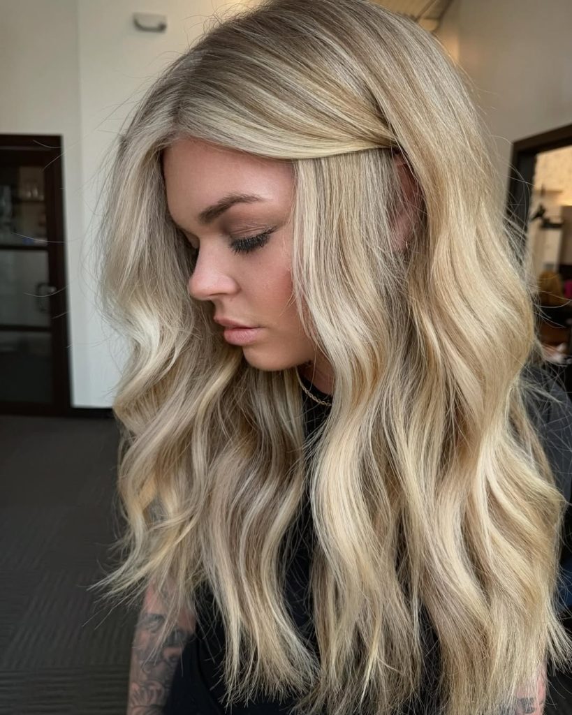 Paired with loose waves, the color reflects light beautifully, reinforcing why 2026 blonde shades are leaning more organic and lived-in.