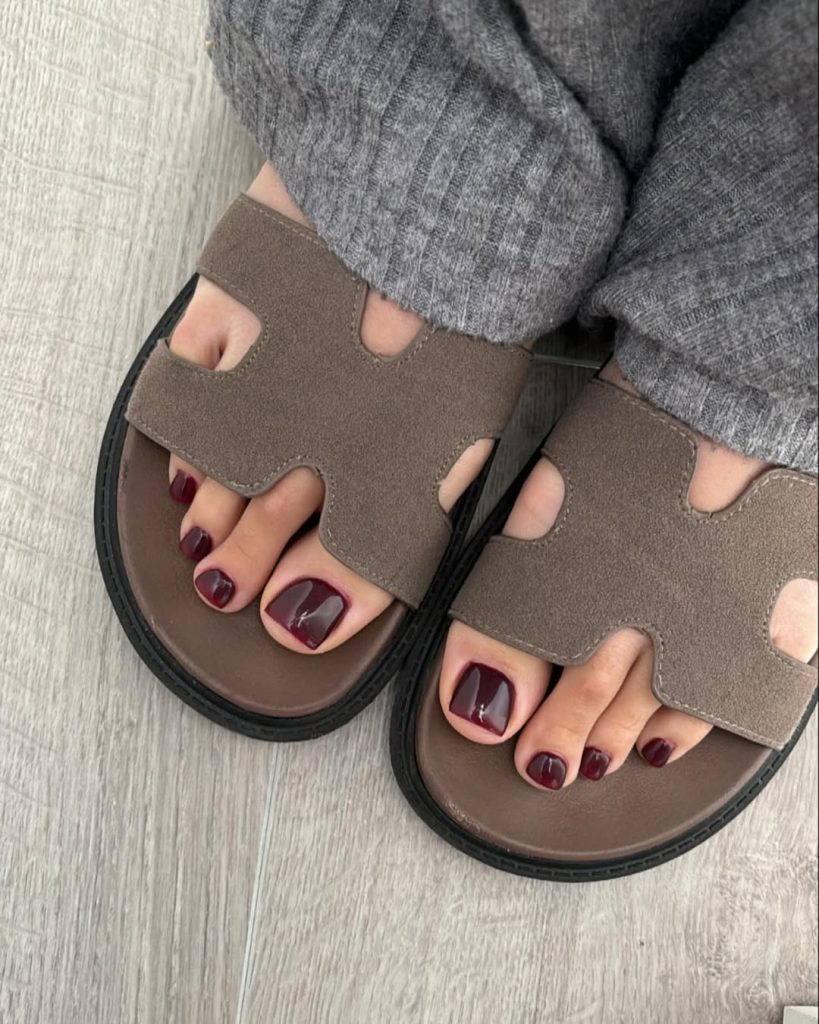 Dark shades don’t disappear in spring 2026—they evolve. This rich burgundy pedicure with subtle shimmer bridges late winter and early spring beautifully. The micro-glitter finish catches the light without overpowering the color, making it ideal for evening events or cooler spring days.