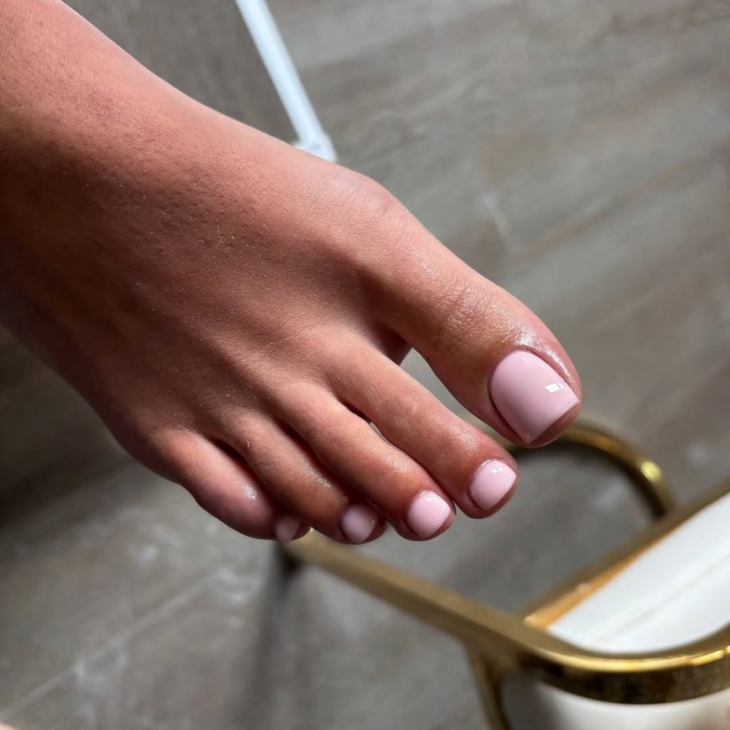 Minimalism continues to dominate nail culture, and this barely-there pedicure proves why. The soft blush tone, finished in a glossy Pink gel, enhances the natural nail rather than overpowering it.