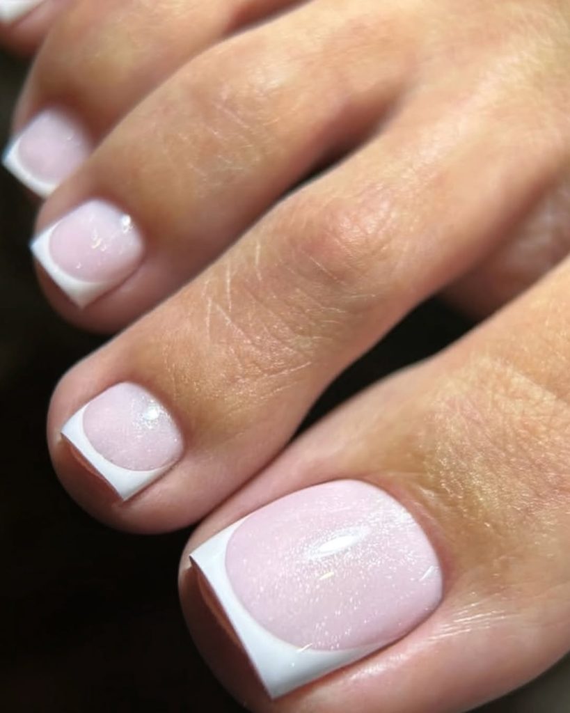 Here, the French pedicure gets a modern refresh. The translucent pink base and sharp white tips are elevated with a barely noticeable shimmer, adding dimension without overwhelming the design.