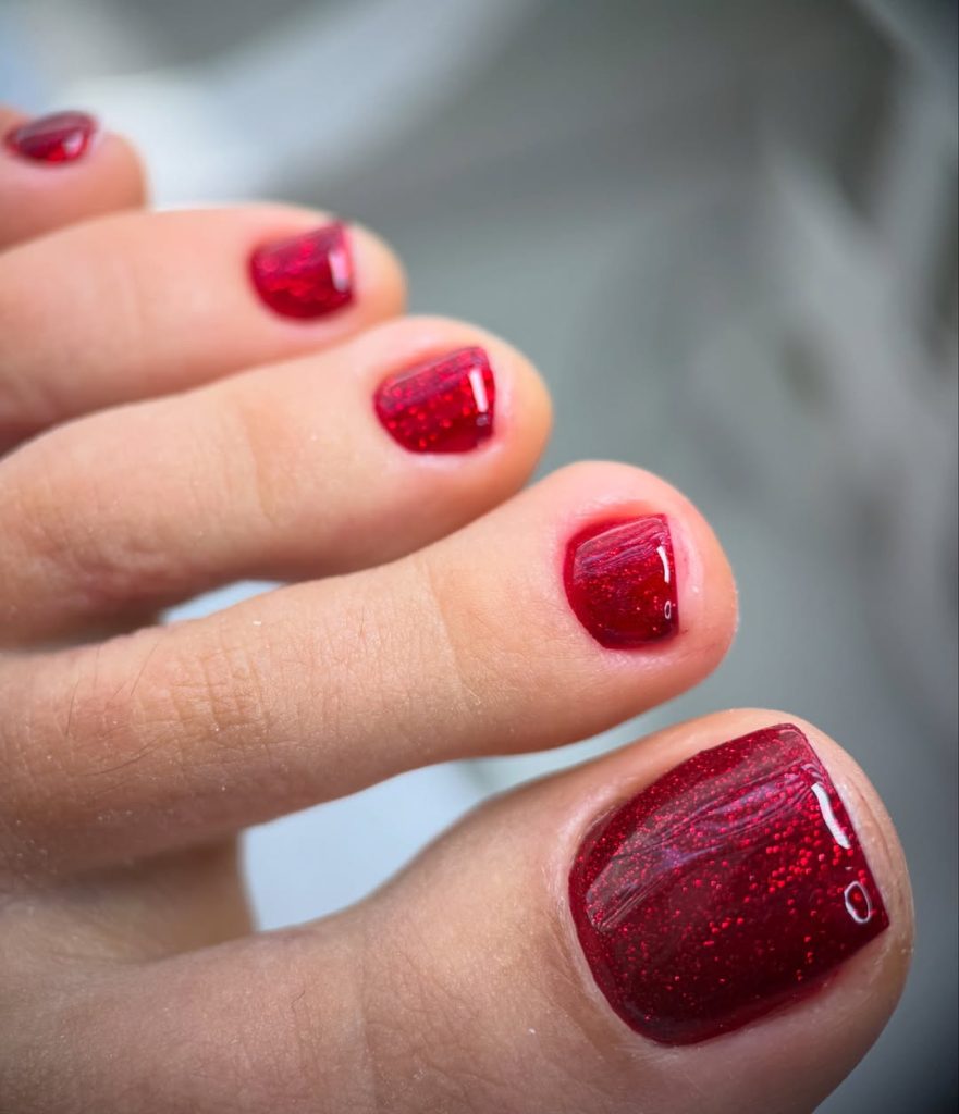 This ruby-toned pedicure leans brighter than classic burgundy, offering a lively yet sophisticated option for spring. The fine sparkle embedded in the polish adds depth while maintaining a clean, salon-fresh finish.