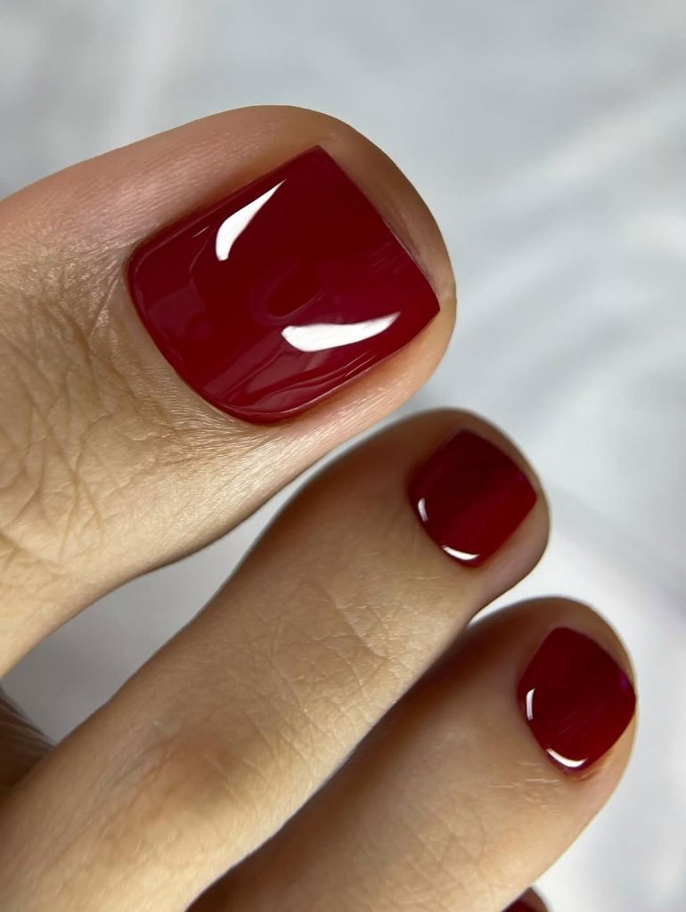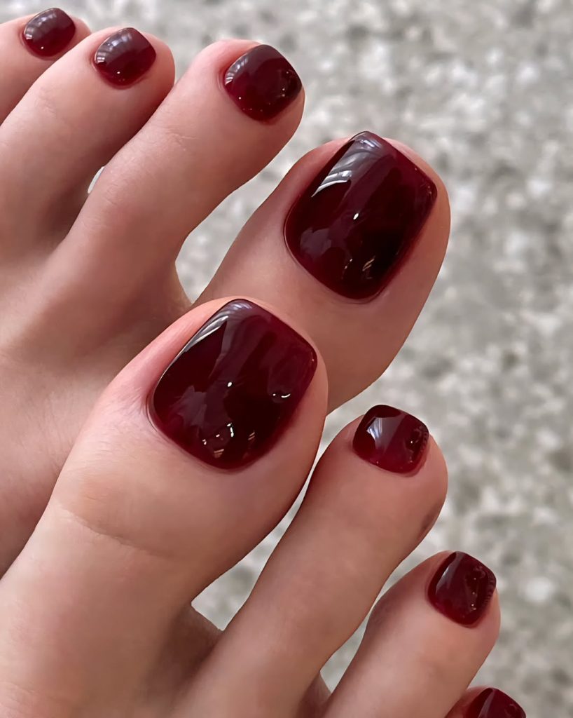 Merlot-inspired shades continue to hold their ground in Spring toe nails 2026, especially for women who favor polish that feels mature yet current. This high-gloss, deep red leans toward wine rather than cherry, offering a softer alternative to brighter reds.
