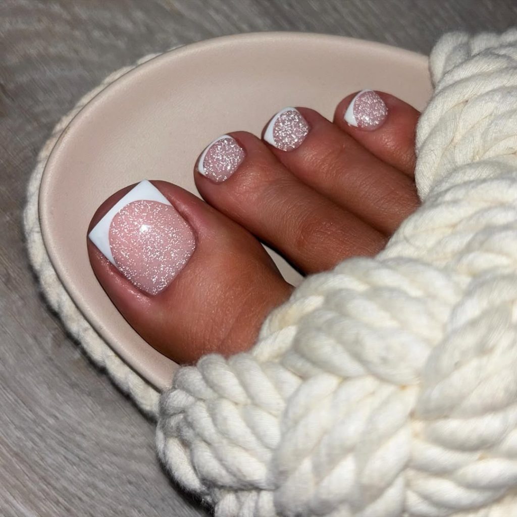 This sparkling French pedicure updates a classic look with a subtle glitter base. The soft shimmer catches light beautifully, while crisp white tips keep the overall effect refined.
